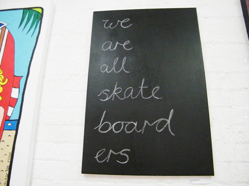 WE ARE ALL SKATEBOARDERS goes on for one more weekend at Cultivate Vyner Street…. Come and see some art, pick up some free stickers and badges, sign up to the campaign, maybe even but a shirt (all money goes to the LLSB campaign, Cultivate does not take a cut); here’s the press release from the opening along with some photos from the first night of the two week show,,,,