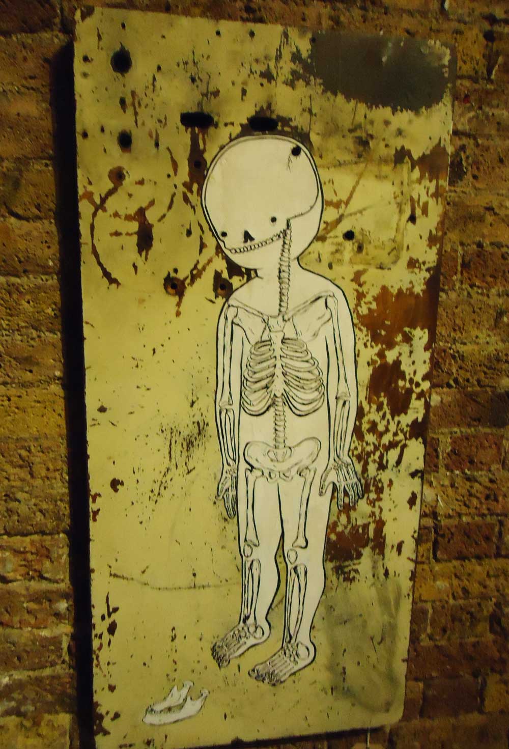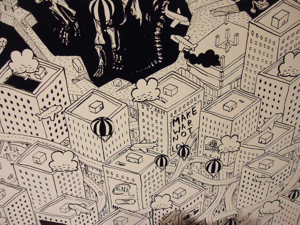 A collection of collaborative pieces from Millo and Benjamin Murphy. A brick coloured subtly lit gallery alive with striking black and white pieces, the results of a collaboration between the two artists and a well balanced combination of styles and a rather intriguing take on inner city reality, of everyday strangeness – a complex simplicity, an easiness that has depth to it. The result of a month and a half of being locked in a studio together with a lot of black coffee, the body of work has a great deal of narrative to it, a sense of a genuine story behind each piece, or at least a sense implied…