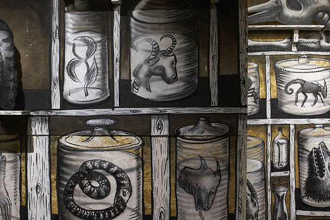 For The Bestiary, Phlegm creates a modern bestiary within his own universe through an immersive and large scale installation in wood, clay and plaster. Here Phlegm presents a taxonomic categorisation of his creatures and collects them in one place for the first time. Within the expansive sections of the installation, and working in bas and high relief, Phlegm displays a series of works akin to the Lascaux cave paintings. Inspired by the bestiarys of old, these works contain untold fables and narratives.”