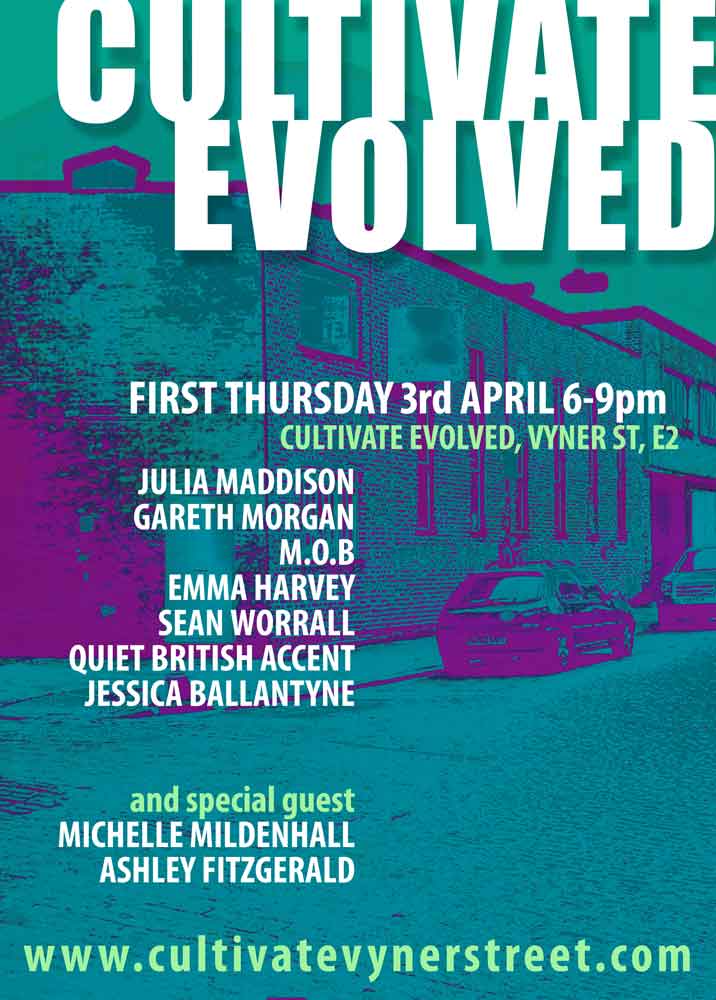 April at the artist-run space that is Cultivate Evolved starts with the long-established tradition that is First Thursday. Cultivate has occupied a relentlessly busy corner street-level spot right in the middle of Vyner Street for some two and a half years now – a corner space that has been used as a DIY gallery space by various working artists, under different name, for something like ten years now. The beautifully cobbled ramshackled street itself has a longer history in terms of art though, that whole history of artists and squated spaces, the throbbing gristle of Psychic TV a DIY tnput in a place no one wanted, a street brought back to life – the Traceys and the Damiens who have passed through, the galleries and spaces come and go (some more exciting than othera), always changing, but always alive, a special place, an exciting creative place, a collective energy rather than about one person or space. .Being on the corner in the middle of it all makes us very aware of all the history and more importantly the responsibility to the community. To repeat something said here the other day;