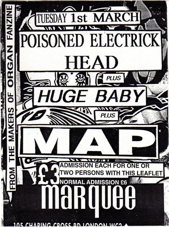 HUGE BABY quite literally exploded on to the scene in a hail of mystery, chaos, rumour and counter rumour in 1994….. There first release was a 10″ EP on ORG and you just could not avoid them around the capital for six glorious venue crushing months –