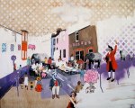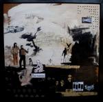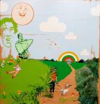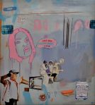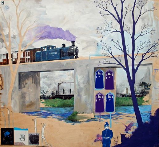 Currently I’m working with acrylic and spray paint on salvaged wood from skips and pallets from work yards I also use canvass and board to paint on too and introduce a bit of mixed media. My paintings have ultimately been undefined by genre. They’re raw and uncompromised paintings inspired by music, films, cartoons, books, travel and personal memories. I like to embrace a communicational breakdown where quirky characters, animals, old stickers and random objects can inhabit the same space as more traditionally painted scenes that fade in and out like memories. Colours and patterns also play a role too both vying for attention within the layered composition. Throughout the work I try to balance control and chaos allowing for an expressive freedom with smudges and random attacks of spray paint but then reigning it in with delicate brush strokes and using bold graphical forms that burst off the canvas”.