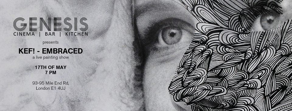 “German street artist KEF! is well-known for his immersive works using fluid patterns and hypnotic line drawings, that seem to almost leap off the surface of the wall or a canvas in a gallery. KEF!, 24, has taken his harmonic vision all over the world, and Embraced now sees him exhibiting at the Genesis Cinema in Stepney Green (East London). This mixed-media show is the first solo show for KEF! in London and it will be spectacularly kicked off with live painting in the cinema’s gallery space on Saturday 17th May from 7pm.