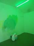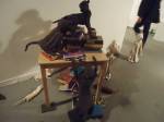 Thursday night in East London…. Conversations between artists at CELL Project Space, Cambridge Heath Road, top of Vyner Street, borders of Bethnal Green and Hackney, you’d never find if you didn’t already know – over the road ftom the Hare, a fine pub where you find art and football – Rotherham versus Preston, playoff semi final second leg, nod of respect to the red shirt King Dennis, decent pint… Pontoon Lip is a new art exhibition hidden in the Cell Project Space (what is with art galleries and not telling anyone where you are, paint a sign!) Two artists – Katie Cuddon, Celia Hampton – and all this without a proper sentence. Without a Proper Sentence being the name of a publication being launched by Katie Cuddon as part of the rather fine conversations between artists at the aforementioned well-hidden unsigned Cell Space – fabric and sculptural work, re-imagined ruin (some of it in lime green light). Two artists responding to each other over an “intense period” of three weeks… The Orient shirt on the wall of the Hare was busy seeing who the Os would face at Wembley, no doubt so were Quiet British Accent. Junior was asleep on top of the jukebox, who’s Junior? We can’t say.