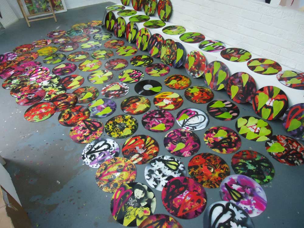 17th May – More vinyl painting at Cultivate, work in seemingly never-ending progress for the 100 Pieced vinyl piece, nothing finished yet, all 100 now have paint on, new layers now growing on them, mostly green today. All being made ready for the Art Car Boot Fair in Brick Lane, East London on June 8th where Cultivate will be represented by myself, Emma Harvery, Quiet British Accent, Julia Maddison, Jessica Ballantyne and more…