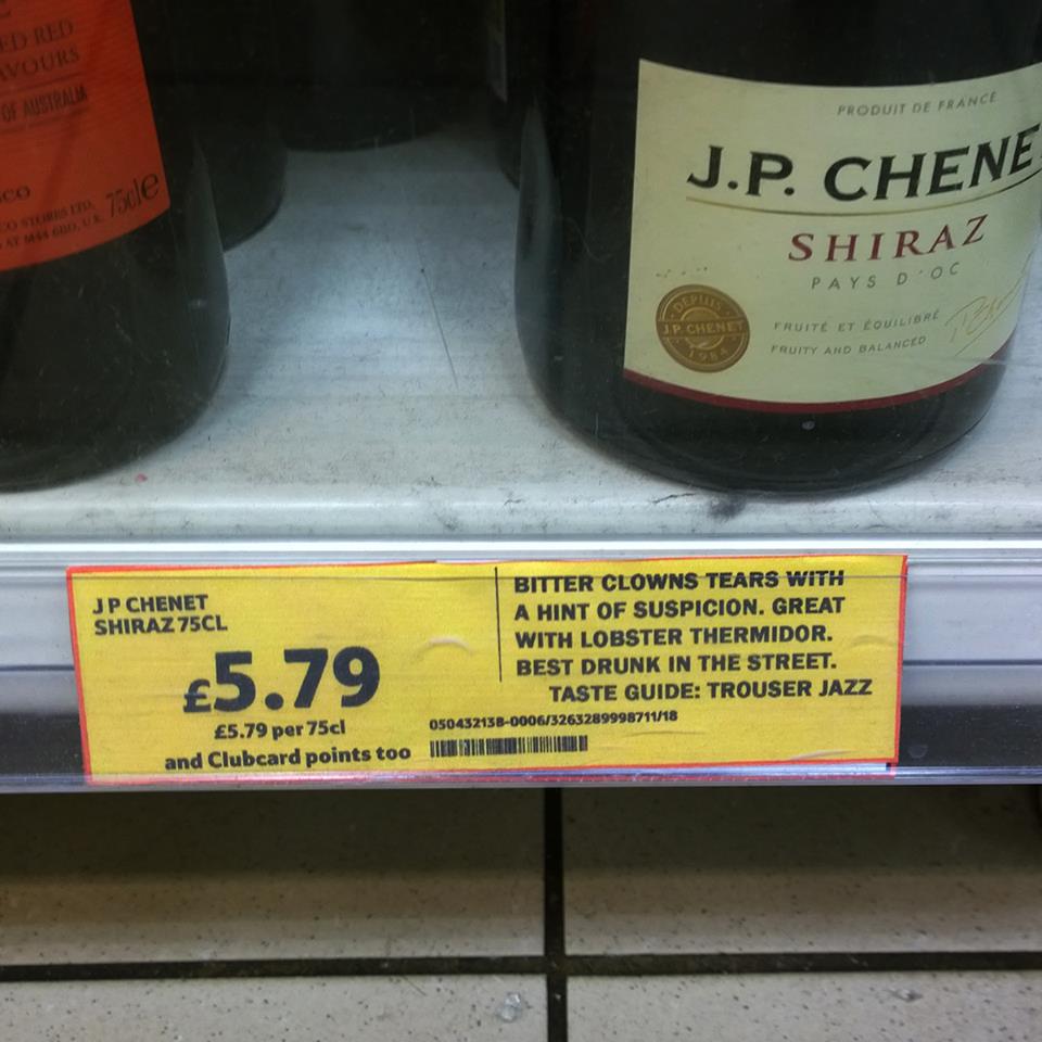 “As seems to happen a couple of times a week I was aimlessly wandering the aisles of my local supermarket searching for an ingredient they undoubtedly didn’t have. I was feeling a little dispirited and glanced at the new wine description they’d put up for JP Chenet. Seeing the halfhearted description made me want to cry a little so I thought I’d see if I could jazz it up somewhat”.