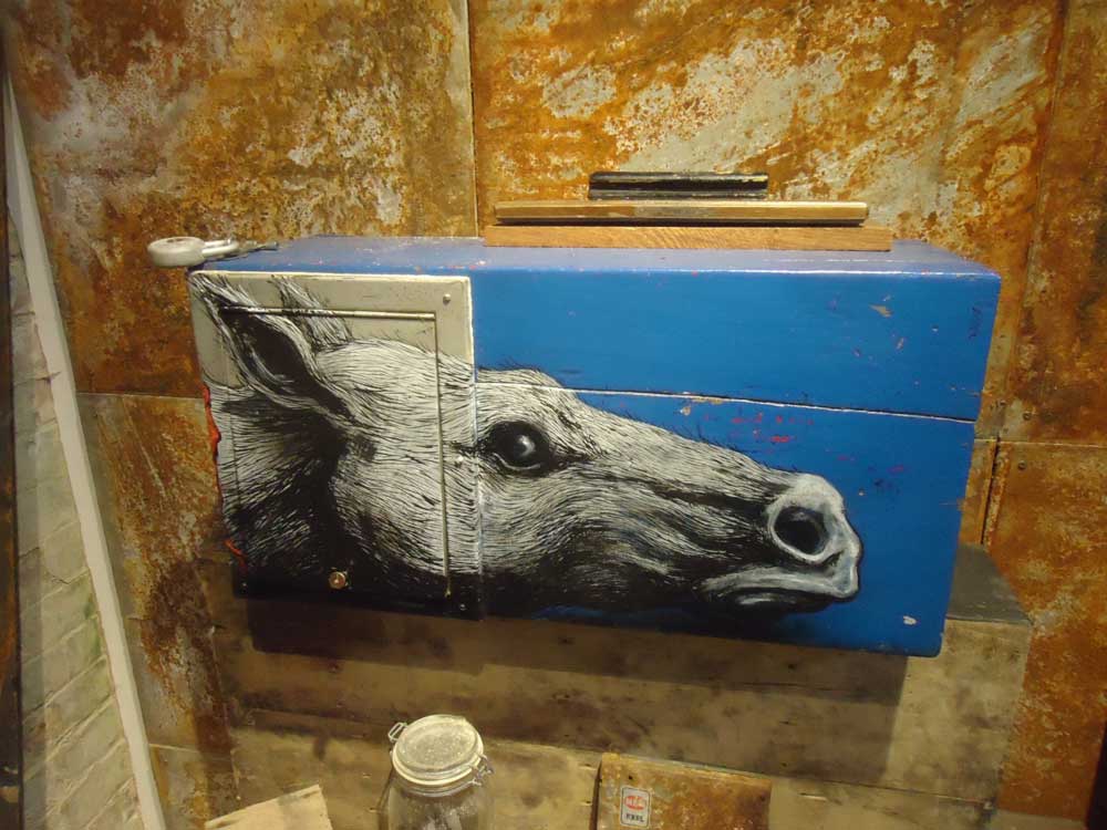 ROA is an artist deeply preoccupied with the significance of the creative process. Working conceptually on each project, he nurtures a dynamic energy which evolves during the restricted time-frame. His method is consistent. Arriving in a location he adapts to his habitat, allowing inspiration to flood from buildings and objects and literally ‘waking up’ to the realities surrounding him. Foraging for the recycled found-objects he seeks becomes a harder task in London, adding a new dimension and highlighting physical process and interaction in this completed body of work.