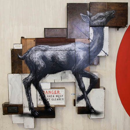 ROA is an artist deeply preoccupied with the significance of the creative process. Working conceptually on each project, he nurtures a dynamic energy which evolves during the restricted time-frame. His method is consistent. Arriving in a location he adapts to his habitat, allowing inspiration to flood from buildings and objects and literally ‘waking up’ to the realities surrounding him. Foraging for the recycled found-objects he seeks becomes a harder task in London, adding a new dimension and highlighting physical process and interaction in this completed body of work.