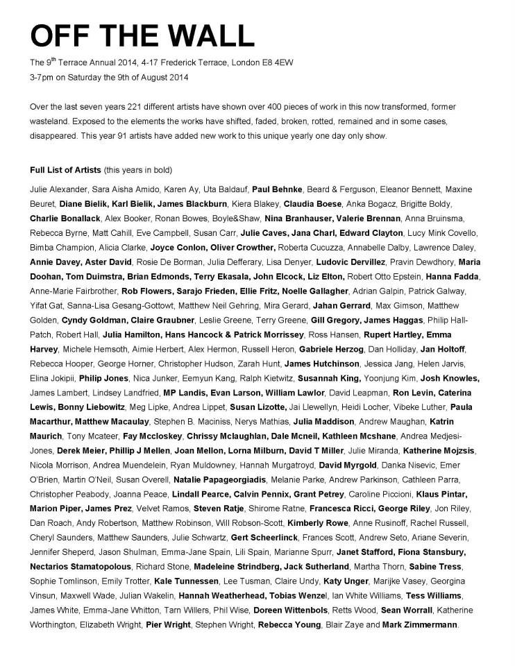 The Off The Wall line up of artists looks like this, bold printed names are the new contributors this year.  All happens today, Saturday August 9th….