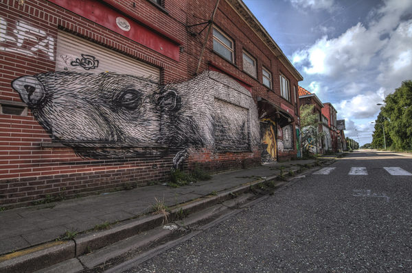 Can we get some ketchup over here? No, fair enough, jam with everything then. Jam on this, good morning, a morning greeting with your jam is always polite don’t you think? What do you think? Where were we? Half way through a pack of sugar-free polo mints somewhere on the edge of some town on the edge of a desert somewhere near somewhere else that isn’t doomed? “Cut the wordery and review some music” cried yesterday’s owl, “that or just put some damn links up so we can click on them and get the hell out off this doomed page”. Something very sad about this doomed village in Belgium, what doomed village I hear you cry? Street art often finds itself growing on the walls of doomed places, fractured inner cities, the walls of faded lives, once proud factories, canal walls that were once alive with the flow of industrial life blood, art reclaiming streets from assault of the advertisers, the shoe pimps and coca-cola pushers, art on the streets, on the walls, it revitalizes, it reclaims, it delights, it provokes (okay it often bores, lot of rathe boring street art out there), the good art adds a smile of colour where once there was just decay… Doel still feels doomed though, seven hundred years of life wiped out and all the street art in the world can’t lift it, maybe its because there no one there now, the place looks like it has given up (the people’s republic of Leytonstonia was alive with art, activism, people and everything else right up until the very last minute of the M11 link-road protests) , Doel looks like a very say beaten-down ghost town that even Roa can’t bring back to life Here’s three photos we blatantly stole off Chris Staring, writer of that recent article on that oft covered Belgium ghost town that now doesn’t have long left…