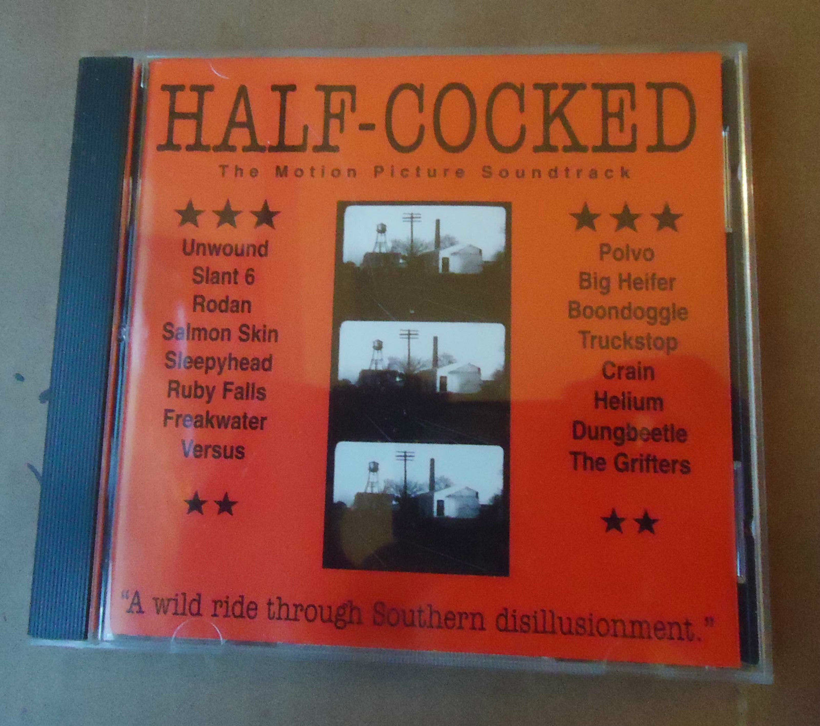 “Tara Jane O’Neil is growing weary of her life at the Rocket House, a party pad filled with crashing slackers, artists, and rock bands. She works as a ticket taker at a movie theatre and hangs out with a group of friends who are equally aimless, skateboarding through the streets of Louisville, KY, and just generally waiting for their lives to start. Her brother, Otis (Ian Svenonius), is the arrogant lead singer of a local rock group called the Guilloteens, and one night after a gig, Tara and her pals steal the band’s van (still full of equipment) and head off into the night. The next morning they find themselves in Chattanooga without money or food, so they pose as a touring rock band called Truckstop and talk their way onto the bill of a local punk show. Despite being utterly unfamiliar with the instruments in their hands, they pull off the ruse, and the band they play with loves their noisy, chaotic sound. Even after their secret is revealed, their hosts give them encouragement and tutoring to allow Truckstop to continue on the road. What starts as a romantic adventure, though, degenerates into bickering, bad luck, and boredom. Half-Cocked features members of indie bands like Retsin, the Make Up, Rachel’s, and June of 44 as actors, plus an appearance by Memphis rockers the Grifters. The soundtrack includes music by Freakwater, Sleepyhead, Unwound, Smog, and others”.