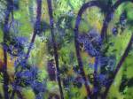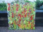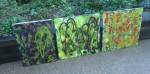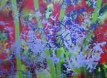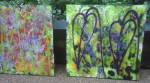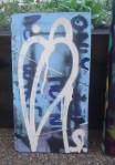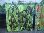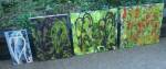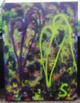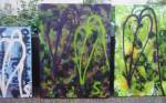 Thursday is fractured screen printing on yesterday’s leaf painting…. two days of S.W layers, acrylic paint, spray paint, screen printing and other bits of growth on canvas and such….