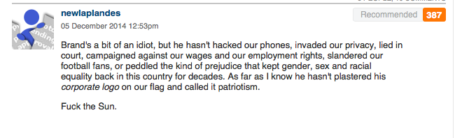 Really is about time the Sun went down for good, this really isn’t really what these Organ pages are about, but that vile “newspaper” has been allowed to exert far too much power and manipulate far too many people for far too long, it really is time to boycott The Sun completely, there are so so many reasons why it has to be taken down, and good on Mr Brand for having the balls to put his career second and point these things out….