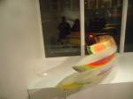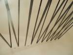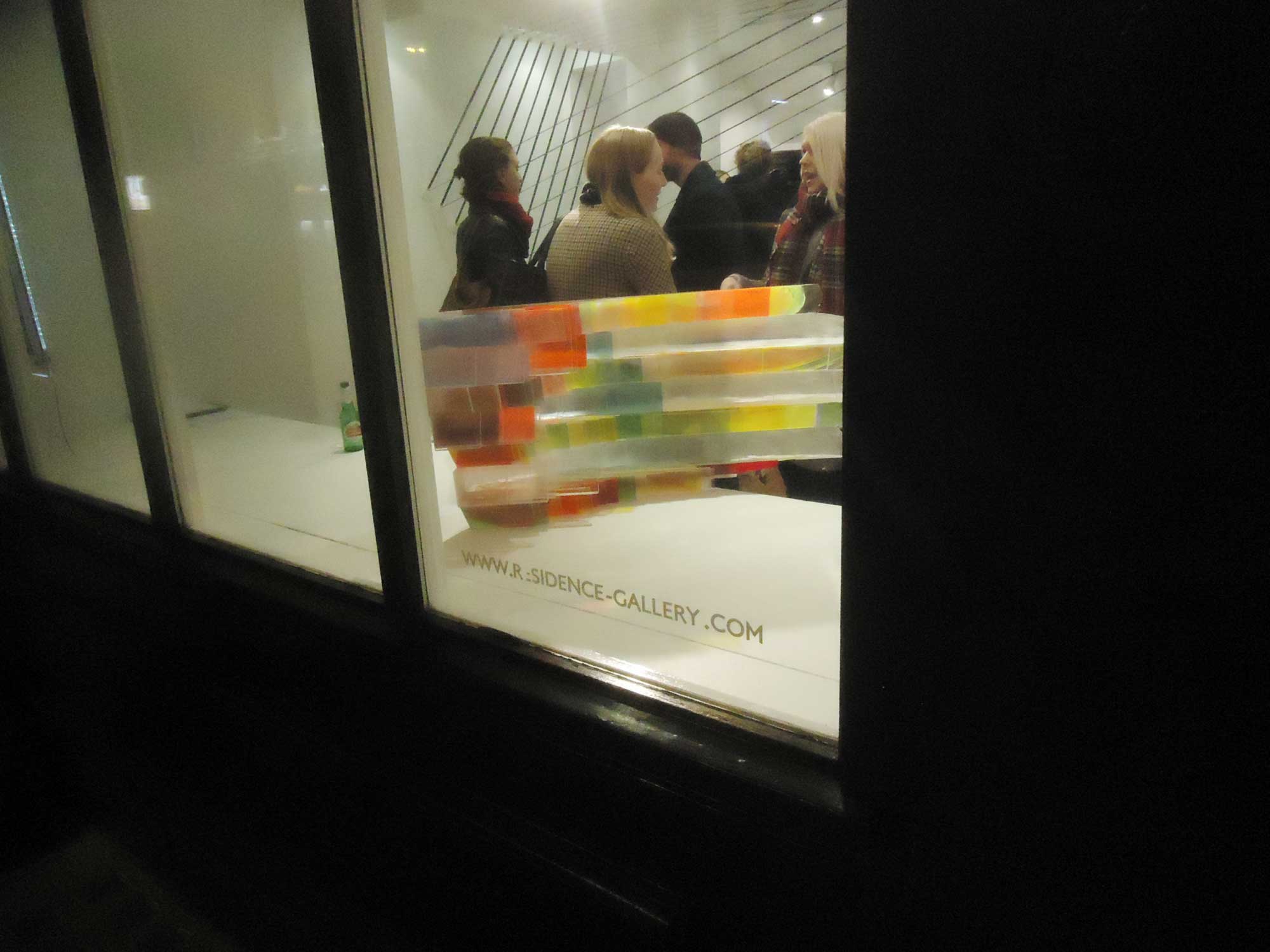 No issue with signs or finding the gallery here, Residence always looks good from the outside and with Daryl Brown’s very colourful perspex piece taking up the boldly lit front window (and the added atmosphere of blue light from the building next door picking out the fruity colours of the perspex piece). Your mind is immediately messed with by the installation waiting for you and dominating the small interior space, the dimensions of the piece don’t immediately register, neither does the material, is it rigid?is it curving? Made of metal? When asked what Daryl Brown thinks of his upcoming exhibition, his response was “roller-coasters”. VHS video tape is actually what the piece consists of strips of metallic looking reflective black tape, and yes the tape does intersect the gallery, your sight lines and your idea of space. The piece probably needs a bigger space to breath in, nothing but white walls around it, not sure if it is a roller coasters as much as a, well no, I’m not going to say, I’m just going to enjoy looking up at it, crouching underneath it, walking around it, catching reflections, enjoying the tricks the piece plays. The piece in the window is a joy, the pieces inside are just as stimulating, another good show at the intimate space that is Residence.