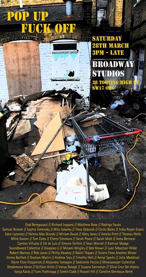Broadway Studios is dying, and in it’s wake will be piles upon piles of luxury flats. We are inviting you to Pop up before we all Fuck off. Art, music and performance throughout the afternoon and evening”