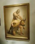 The born and bred Londoner has background in street art (as well as the 80’s/90’s hip hp break-dancing scene), street art background but there’s a more traditional artistic discipline here, an almost traditional painterly approach. Cosmo Sarson‘s early work explored “themes around Hip Hop culture, creating almost trompe l’oeil images of break-dancers, skateboarders and bmx riders”, this is exploring a lot lot more now though. Apparently he gave up art and hung up his brushes in 1997. Well he says he hung his brushes up and walked away, no one really walks away from art, you can’t walk away, it will always be there, in your blood, pecking at you, more of a need than an addiction, Cosmos is well and truly back, his giant Jesus wall pieces demanding attention down in Bristol, his work is now celebrated far and wide and this is a solo show from an artist really putting down his mark. There’s more break-dancing Jesus pieces here on the walls, the details on the less demanding pieces, the pieces that you maybe don’t notice at first, are the ones that really stand out, this is a show to really explore. There’s a depth to the work on he walls in here, a fine artist at work, he’s as much about Caravaggio as he is about urban culture, a restrained understated coming together of street art style, Catholic imagery, Greek mythology, of gods and monsters, of rich maroon, burnt orange, striking reds, classical motifs, black and white details, dark corners, as much about the style of the Old Masters as i is about hip hop attitudes, Sarson is a real painter, a proper painter, maybe even a timeless painter, this is a proper painting show, our Thursday has been rescued, we needed some painting tonight, our need was fed….