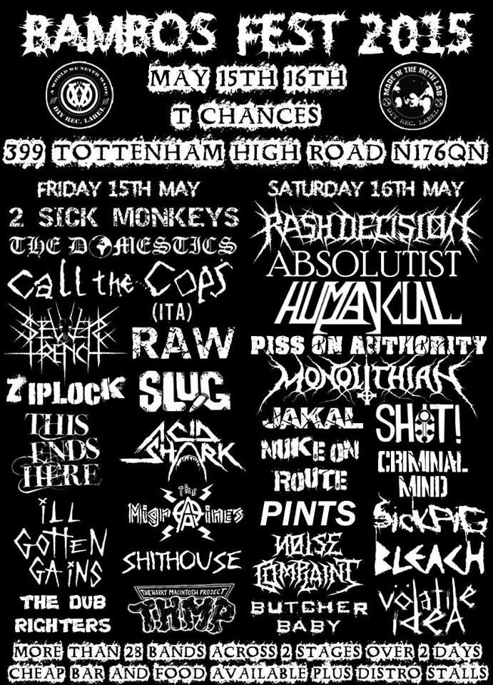 A two day punk rock fest then, a bag load of politely named bands, all happening at T.Chances, 389 Tottenham High Road, London, N17 6QN, Two stages, two days, distro and info stalls, cheap bar and food, £8 entry each day, £15 two day ticket, more on the Facebook page… And “bring your own t-shirt/jacket or panties to be printed with the logo of the bands during the night by The Minesweeper Collective”