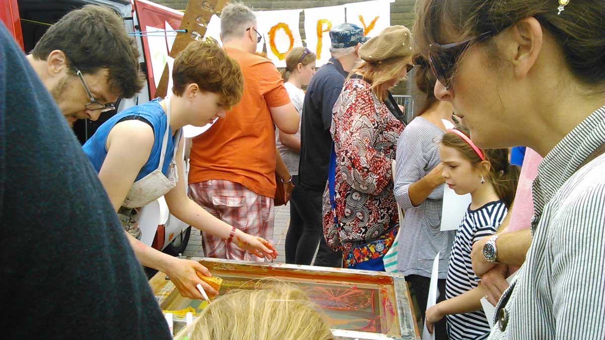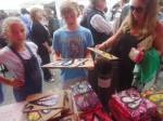 Let’s not fail to notice what the kids are doing – they’re nagging their parents to buy paintings they like, or having a go at printing, or watching the little girl who has her own stall and is selling her own paintings. And the things that aren’t free to do or watch are ridiculously cheap. Oh, I can hear that cynical voice right there as I type this, that drizzle of superiority that crushes, that doesn’t get it. Well, in the sea with you. It’s not perfect, but the quality is there, the spirit is there, and it’s up to you whether you engage and enjoy and appreciate it. We love it. It’s your loss, mate.