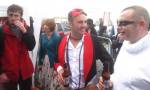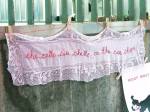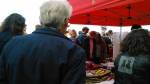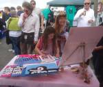 Anybody who thinks the Art Car Boot Fair, particularly this Margate edition, is all about money, is a cynical knotted hanky-wearing old grump who needs to get in the sea, preferably at high tide and during a gale. Yes, there’s a queue for the Big Names at these things, and yes, people are there because bargains, because ebay, because ooh look there’s a famous person etc etc. And then the queues calm down and the families and dogs and curious and the arty eccentrics mingle and stare and laugh and a sweet and funny and unique day out is had by all. Can we please, please, have a little more focus, by the redoubtable journalists of our land, upon the less famous purveyors of art who make up the stalls of the ACBF each year, rain or shine? And the peripheral madness such as the Alternative Ministry Of Transport with their treadmill-driven monstrosities, or the galleries in garden sheds, the live screen printing, the performance art, the pin the tail on the artwork and the great little paintings that you have to dig through crates and lift into the light to appreciate… the gutsy ceramics, the bookshop in a caravan, the unknown local artists that the ACBF always try to include in their non-London outings.