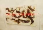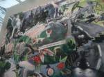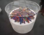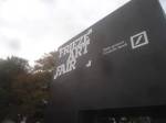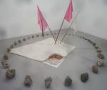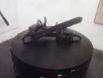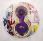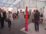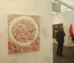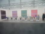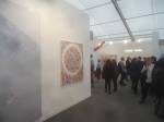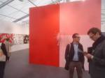 Of course there’s not a hint of any spray paint in here, besides the pink and black mess of my fingers, I don’t know, what do I know? What am I even doing in here? Enjoying my afternoon, that’s what I’m doing, been in here for hours now, wish I could afford a cup of tea. Like that Maria Bartuszova egg the Alison Jacques Gallery have over there, the late Maria Bartuszova “a little known Slovak sculptor, revealed to the general public in 2007 during Documenta 12 in Ka Kassel”, seems she died as a rather unknown artist at the age of 60 back in 1996. And the distressed chair and the hoovers arranged in a circle on the wall (plugged in as well, do they switch them on?) in the Galeria Stereo space, a gallery from Poland so it seems, and those pink flags in the stone circle, from another gallery from Poland. The guns mentioned earlier were from the Peter Kilchmann gallery in Zurich, so was the painting of girl, the blue one, the Dave Muller MC5 thing is being shown by Blum and Poe from Los Angeles, as is the rather impressive circular Tikashi Murakami piece next to it. Brothers and sisters, time to kick it all out, the MC5 piece made me smile, the circular piece made me smile, Blum & Poe’s space made me smile, see, I am enjoying it in here, might just come back for more tomorrow (if they haven’t cancelled my pass), apparently this press pass means I can keep going back until it ends at the weekend… So much to see, hard to take it all in at once, been in here for three or four hours now, need to go, come back tomorrow,