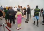 How many men in expensive looking suits rebelliously not wearing ties while they talk loudly on their mobile phones can you gather in one place? All on their phones, all without ties, dealing away, all quietly though, respectful, polite, nice. “Yes, if you want to meet the artist, I can arrange that, she’d be delighted”