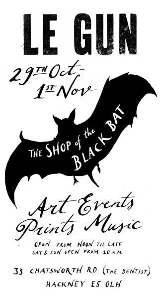 le_gun_dentistMeanwhile, for what it might be worth, we see LE GUN‘s Shop Of The Black Bat opens today from 12 noon up at the Dentist, 33 Chatsworth Road, london, E5, top end of Hackney, and will slip into opening party mode around six with Nervous Stephen spinning spooky vinyl and a licensed bar and bonfire in the garden. It’ll run for 4 days before dematerialising on Sunday night…  We like the Dentist, fine organic wreck of a venue, been some interest music in there this year, always enjoy going there, although talking to to some people, or trying to can be a little like clapping with one hand (do like an Anthrax quote with the morning coffee). So anyway, the Denist, Le Gun, kicking cans, leaves, eat, shoots, been trying to do something with the Dentist all year but hey, the wind hasn’t been in the right direction, do like that space, I hate seeing spaces locked up when they could be alive with revitalised this and that  .  So anyway this weekend black bats, sometimes  found sound, what do we know.  Maybe if we grew beards and tried fitting in a little more? Le Gun then, mind the spiders, you’re in a rut, you’ve got to get out of it…