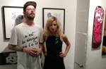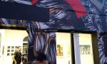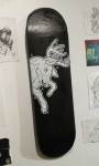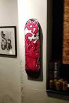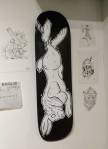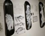 The small backroom gallery space of the Parlour Skate Store on the aforementioned Hackney Road is the first destination, Frankie Strand and This One are sharing the space and a collaborative show called The Nature Of It. The two of them have been collaborating and complimenting each other quite a bit recently, painting walls together, Frankie’s bold colour, This One’s black and white graphicness. This show isn’t really a traditional gallery show or in a traditional gallery space, but they are confined and up there on relatively polite white walls, would the formality of it work? Well we know This One’s work translates well, be it on doors, on canvas, on old bike frames, be it big to small, his black and white tattoo-flavoured style has graced a number of formal gallery walls in recent months, tonight he’s making use of used skateboard decks, and of course it works, of course it does.