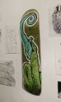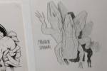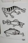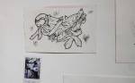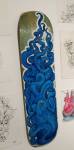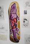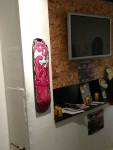 Frankie Strand we only really know from her big outdoor pieces, her work certainly thrives on the crumbling London walls she’s been enjoying recently, her green and purple lizard creatures, her animal shapes alive within the detritus of the East End streets, her climbing up scaffolding and while it works when you see it high up on a wall or on the opposite canal bank from the one you’re walking on, would it work on a gallery wall? Frankie Strand’s street work doesn’t really do her justice, taken down to gallery scale, corralled in to frames, on to skateboard decks, her illustrations really do come to life, if anything, her almost primitive style is more engaging in here, her energy, her positively-engaging cartoon colour, her graphic comic book flavoured illustrations really do work in here. And of course the two artists work well together, the styles bounce off each other in here just as they do on the streets. The lines, the sense of line, the natural understanding of each others style, they really so seem to naturally work together, natural really is the word here. This isn’t really a formal gallery show, we’re in a slightly messy back room of a fancy skateboard shop, the two of them do work as well together here on white walls as they do on the streets, we knew This One would work in the small back room, we’re pleased to report Frankie’s style really comes to life on a small-scale on a born again skateboard deck or a piece of paper torn from a sketch book and pinned to a gallery wall in a frame… The nature of it all indeed. A show and a couple of artists well worth your time