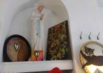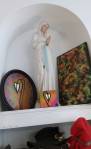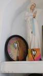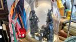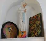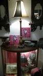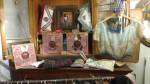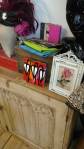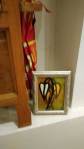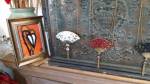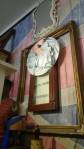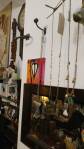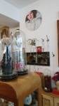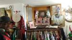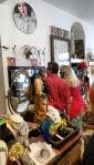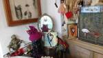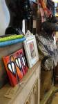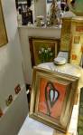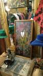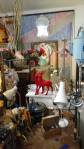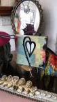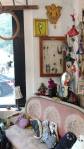 Harvey and I had been wanting to get in here and do something from the moment curiosity dragged us both through the inviting open door, and this weekend we got to. They did offer to clear some space, but no that would defeat the object of the exercise, what we wanted to do was almost hide our pieces of canvas and such in there to be discovered in with the almost forgotten objects and the vintage artifacts, the textures, the postcards with the old messages on, and the textiles, the colours and the feathers and the old suitcases with the 1920’s stickers on and the distressed frames and faded hats reborn and the furniture and flags and flowers and the wonderful jewels…
