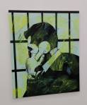 Sr.X avoids all the traps, in the same way that Agata Cordoso uses her camera to paint so gloriously, Sr X uses stencils to really really craft his bold stylised work, well on the evidence of tonight he does, outside on a grander scale his art seems rushed and nowhere near as exciting as it does in here with these relatively smaller made-for-the-gallery well worked pieces. Beautiful use of colour, a touch that is delicious, his detail alive, his canvases full of brilliant contradiction, areas to focus in on, a cynical smile, a background featuring some half-hidden advertising slogan that you didn’t notice at first, a strap line, a noir stroke, a pop twist or two, a glimpses of Bob and a taste of discordia, Church of Subgenus, a comic book flow, 1950’s hope, Stan Lee, balance, sharp smiles, perfect teeth, “bulshit” for sale all warped and wrapped up in nostalgia, warped nostalgia indeed, gloriously so, not quite too sickly sweet. A damn fine show an an evening saved by the last gallery of the first Thursday of September 2016…. .