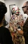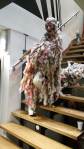 The two performances at the opening night of Debased somehow worked so strangely well together side by side. Marnie Scarlet’s first interactive performance art piece ‘Face Dress’ featured her ‘Dress that is made of Me’ – a dress full of used make-up face wipes, full and flowing and trailing out behind her. She entered the space with a clean white make-up’ed face, and began to paint on bright blue eyebrows, rosey red cheeks and a paint roller of bright pink rolled over her lips ‘Don’t I look beautiful?’ she asked. Oh yes. No mirror needed here as the audience answered her question as we enjoyed the bright paints covering her face. We were then invited to pin on more of her used face wipes onto her dress, fill out her dress with used wiped off make-up, making her even more beautiful. The performance ended as she took off her freshly applied painted make-up with a wipe which was then also added and pinned to her dress and off she went with a flourish. We cheered, we clapped, we laughed (with her and at ourselves) and all our made-up faces cracked with delight… Fantastic.