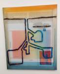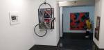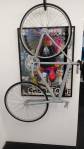 Besides the bike hanging painting-like as part of a framed piece, Dan Pasteiner’s work in this particular show is very much about the convention of painterly work on walls, about relatively flat surfaces, square or oblong pieces hanging vertically in that was that paintings usually do. However much they are about the texture and colour, the work is very much approached as a collection of “conventional” contemporary paintings would be. Textures, surfaces, relationships between those textures and marks, tactile relationships, surface tension, details within… it doesn’t feel like colour is a priority here – that isn’t necessarily a criticism – this does feel like an artist enjoying texture, enjoying the marks and relationships and tensions between different materials within a piece, about materials, about surfaces. There is a table in the middle of the gallery, it isn’t clear if is part of the show? Actually this is a rather difficult show to read, the artist offers very little in terms of written information to accompany what is, it has to be said, a rather disjointed show. Is that table part of it? Are the printed words within the pieces anything more than texture? And what about that piece that features as the image in the small bits of on-line publicity that do exist for the show? No sign of that piece of sculpture in here? Actually the artist seems more interested in telling us about his education and listing his previous shows than telling us anything about this one, don’t really care which art school you went to, what’s that piece over there about? What are you exploring here? Exoplanet? A planet that orbits a star outside the solar system? Dive bar? His website isn’t that up-to-date either but there are some interesting images on there, pieces that suggests there’s a lot more to Dan Pasteiner than this show is revealing.