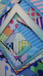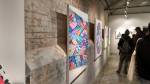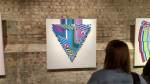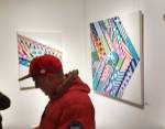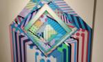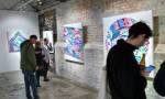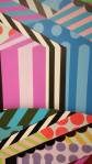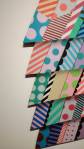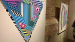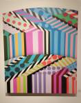 New York based artist Jason Woodside’s latest solo show opened at East London’s Stolen Space last night, a room full of beautifully slick paintings hung perfectly on those raw brick walls of the art gallery. Woodside’s very bold work is alive with vivid colour, with contrasting layers of simple, geometric patterns. The paintings kind of look like piles of textiles, piece of clothing, flat colour though, no texture, no sense of a texture, well almost flat colour, there’s some very clever playing with depth and dimension, some delightful shadowplay that almost requires you go and try to lift a layer to reveal more of the next..You’d have to be a really cynical artsnob to not feel good in here with these bold colours, with these gloriously bright canvases alive with graphic goodness, with these very clever pieces of simplicity that are making people smile (and no smartarse mentions of Paper Chase). Rather like Hackney’s own born and bred Charlie McFarley, Jason Woodside “brings the bright colours to the concrete jungle of his hometown of New York City and around the world”. Known for creating huge murals and apparently widely recognised as a leader go the ‘post-graffiti movement’, he is indeed pushing the boundaries of what traditional urban art is 9and thankfully not a hint of a Mickey Mouse with a gun, a bad Bowie stencil or another damn rat holding another damn balloon). And yes, there is a bright optimism here, a kinetic uplift, this is gloriously bold, crisp beautifully performed, a dance of confident colour, shape and parallel play. Excellent show, Impossible not to smile in here with Jason’s clean lines, another excellent art show, another triumph, do go refresh yourself (sw)