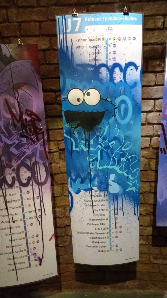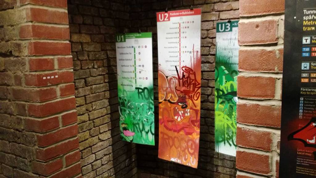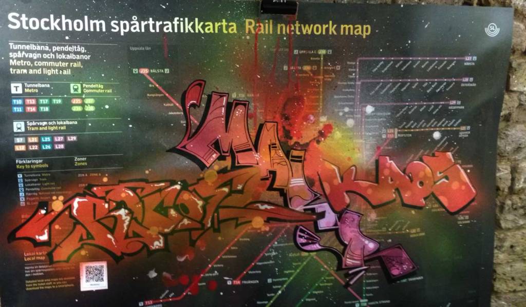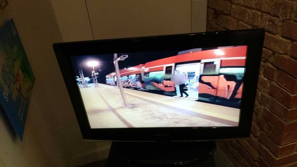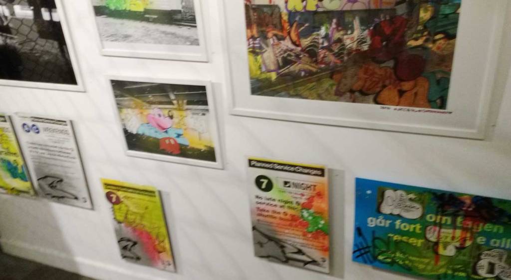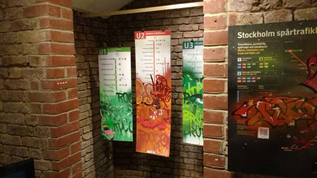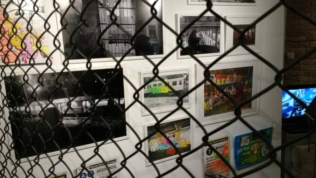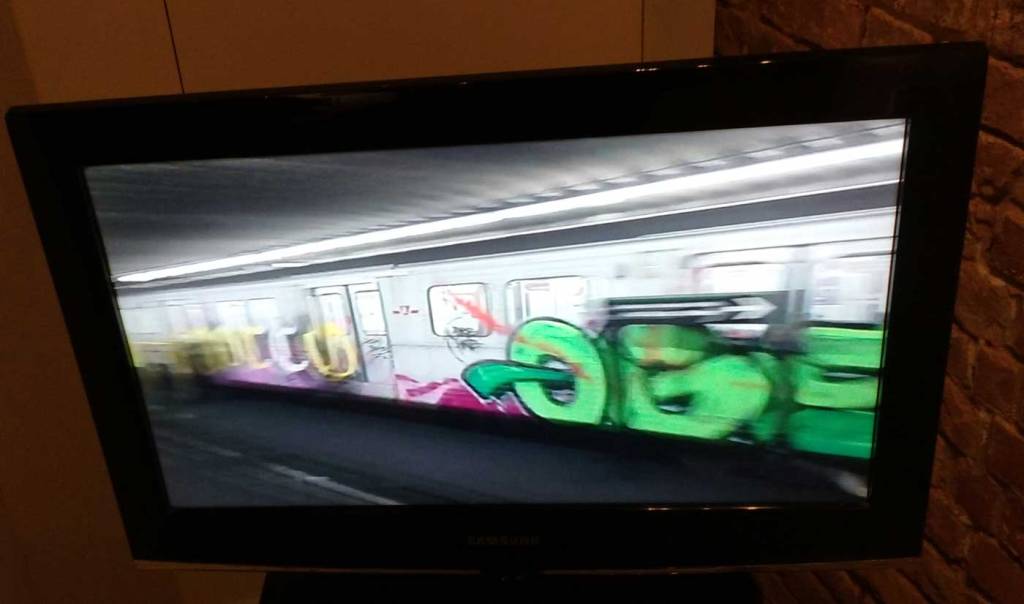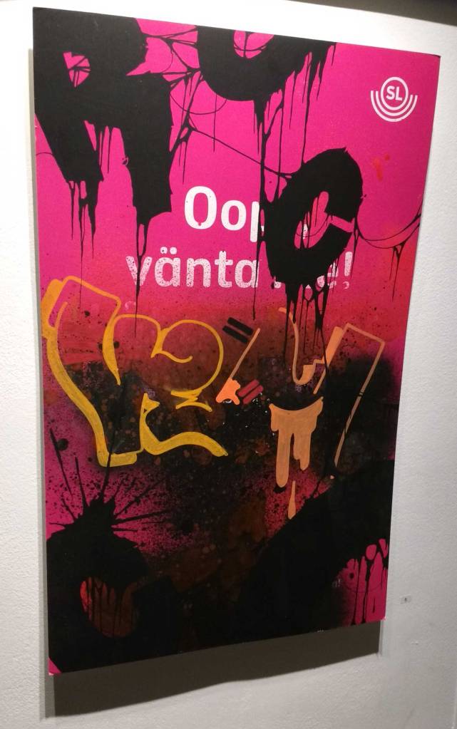 Three artists, two from Sweden, one from Germany and transport paraphernalia “stolen” from all over the globe, timetables from South Africa, train maps from New York, bits from Gothenburg or Berlin – it feels real, compelling, authentic, it feels exciting. The films and videos are the real points of interest, the footage of trains actually running, the installing of sculpture in Berlin city parks (in front of the confused looking Berlin police watching on). True, the actual physical art, the actual graff on the train maps that’s hanging on the actual gallery walls in here tonight – when the actual art is reduced to just the drawings and paintings on a train timetable on a gallery wall – well then the actually quality of the art might not be of the very highest, but that’s really not the point and this isn’t a gallery show about artwork on a gallery wall. This is about work really out there, about lives, about art on the streets and when these artists are out on the actual streets and their work is in the walls outside – and some of those photos on the gallery wall are brilliant – when the art is out there on the advertising boards and train time tables living and breathing, then this is excellent art – this is art living and breathing, vital and far far more vitally exciting and worth of space in here tonight than just some over-slick street art type who never leaves the gallery (unless he or she needs to publicise their next gallery show or slick print release).