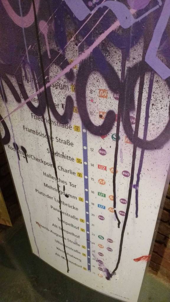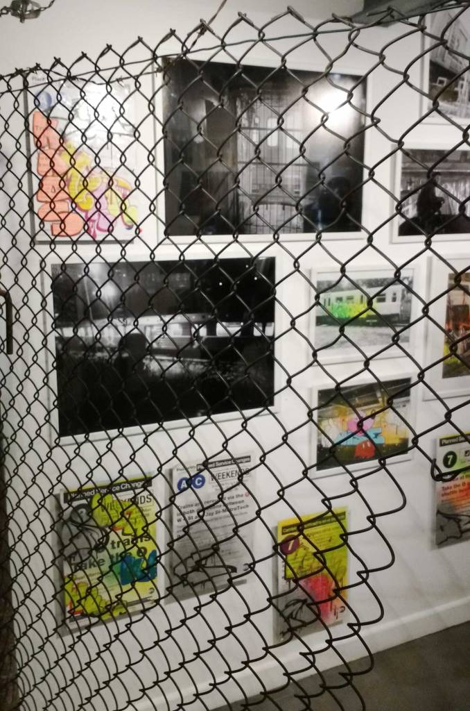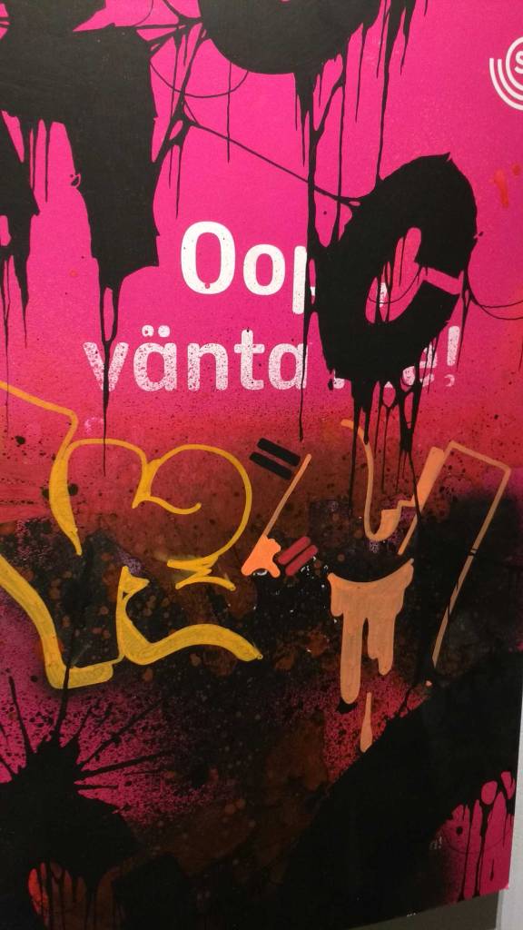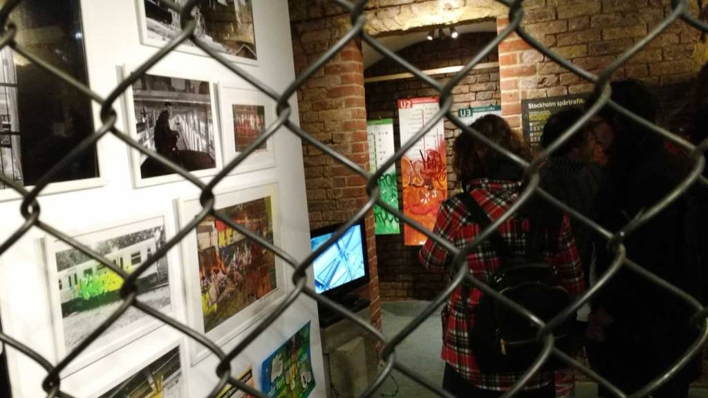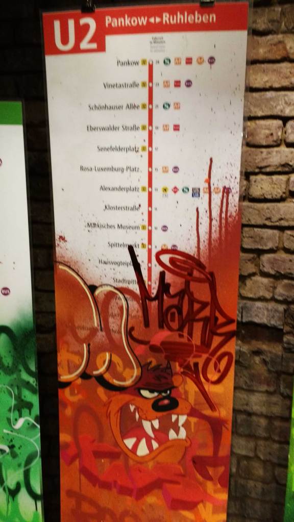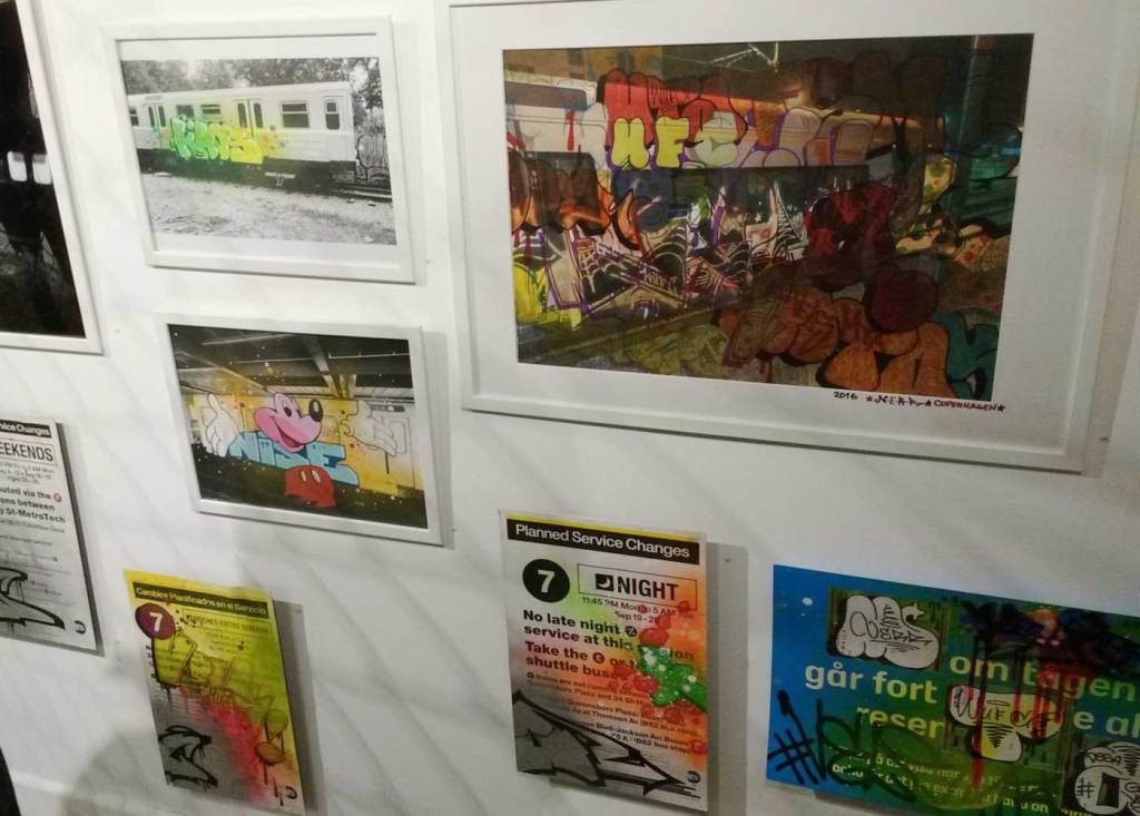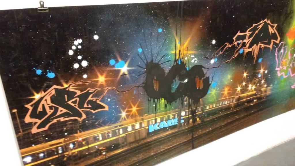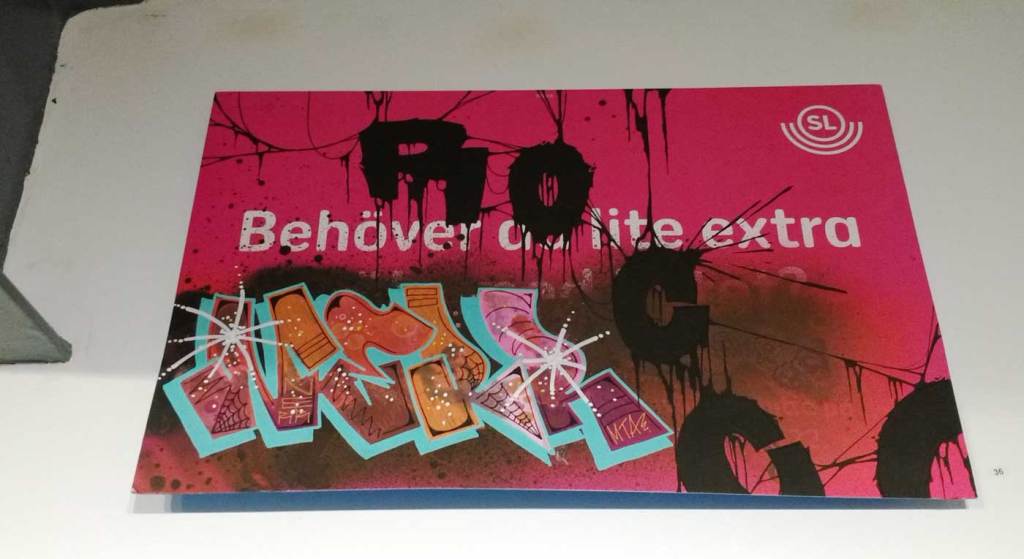 Three artists, two from Sweden, one from Germany and transport paraphernalia “stolen” from all over the globe, timetables from South Africa, train maps from New York, bits from Gothenburg or Berlin – it feels real, compelling, authentic, it feels exciting. The films and videos are the real points of interest, the footage of trains actually running, the installing of sculpture in Berlin city parks (in front of the confused looking Berlin police watching on). True, the actual physical art, the actual graff on the train maps that’s hanging on the actual gallery walls in here tonight – when the actual art is reduced to just the drawings and paintings on a train timetable on a gallery wall – well then the actually quality of the art might not be of the very highest, but that’s really not the point and this isn’t a gallery show about artwork on a gallery wall. This is about work really out there, about lives, about art on the streets and when these artists are out on the actual streets and their work is in the walls outside – and some of those photos on the gallery wall are brilliant – when the art is out there on the advertising boards and train time tables living and breathing, then this is excellent art – this is art living and breathing, vital and far far more vitally exciting and worth of space in here tonight than just some over-slick street art type who never leaves the gallery (unless he or she needs to publicise their next gallery show or slick print release).