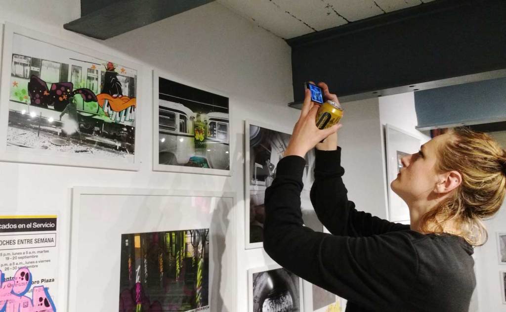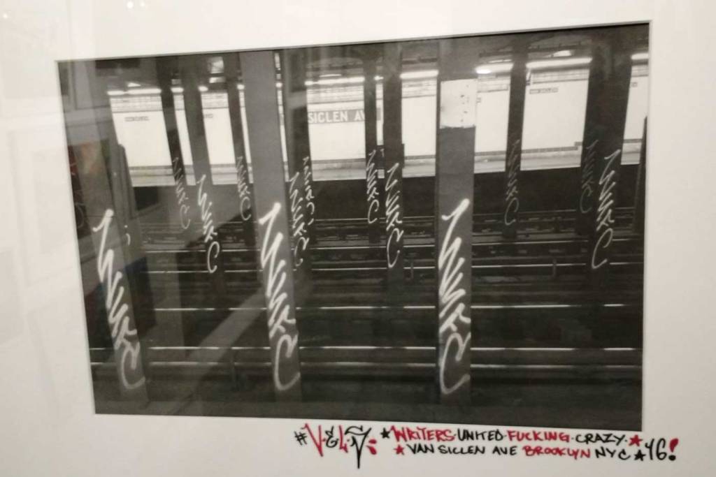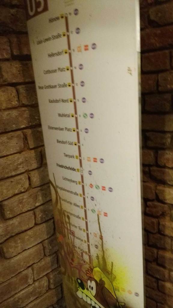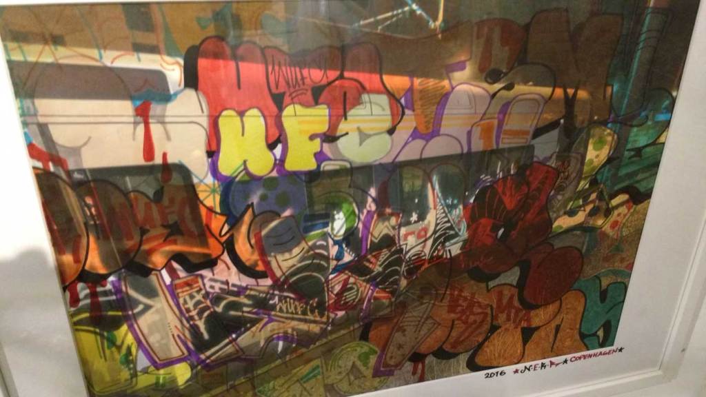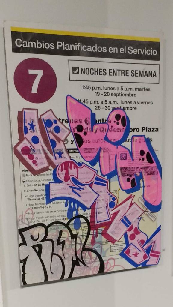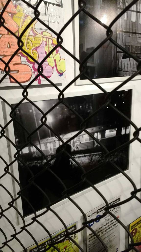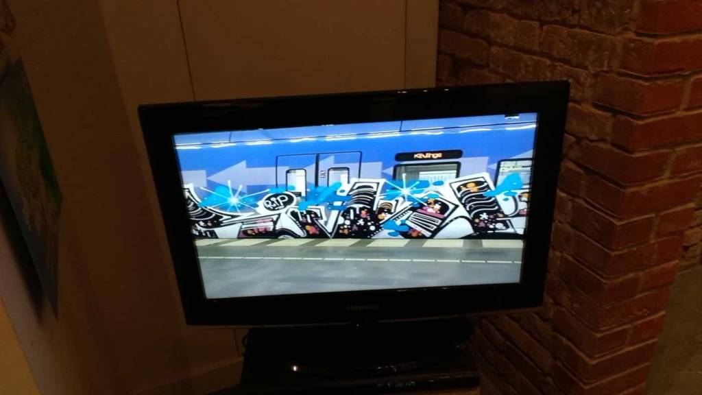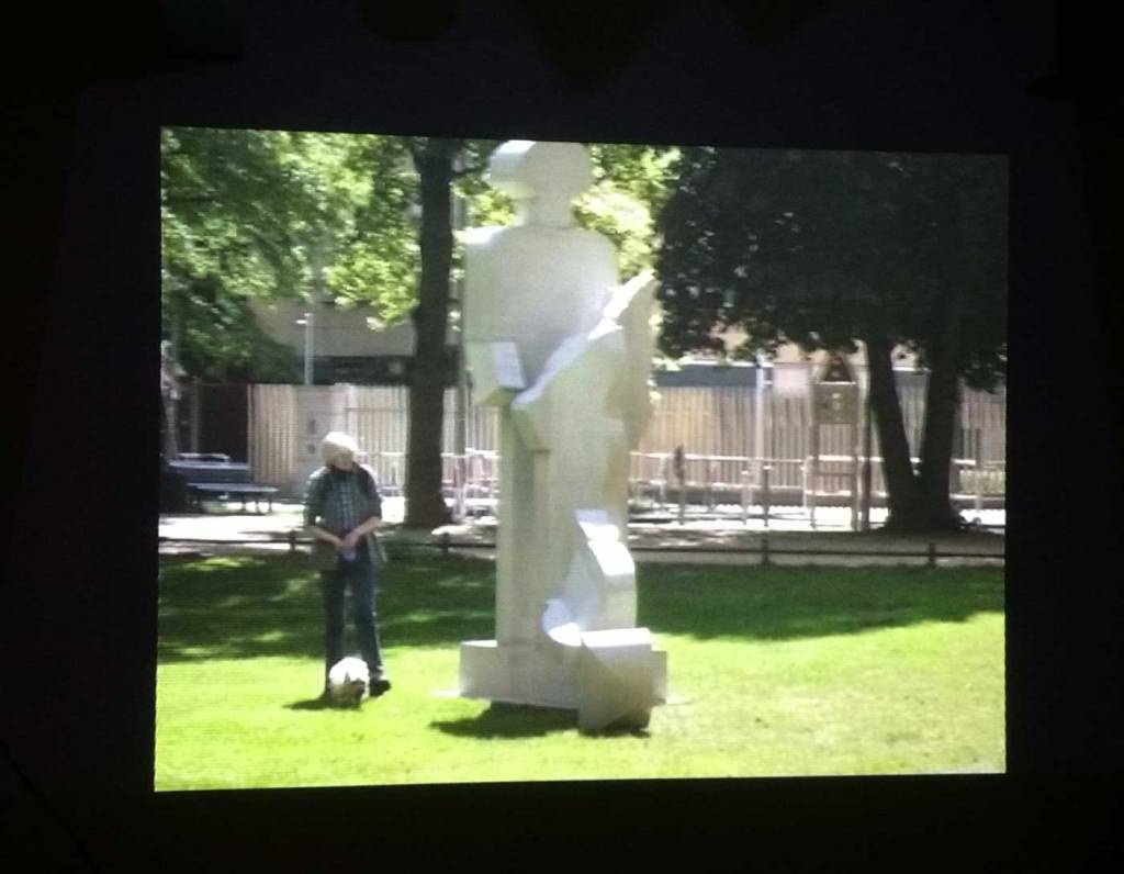 Three artists, two from Sweden, one from Germany and transport paraphernalia “stolen” from all over the globe, timetables from South Africa, train maps from New York, bits from Gothenburg or Berlin – it feels real, compelling, authentic, it feels exciting. The films and videos are the real points of interest, the footage of trains actually running, the installing of sculpture in Berlin city parks (in front of the confused looking Berlin police watching on). True, the actual physical art, the actual graff on the train maps that’s hanging on the actual gallery walls in here tonight – when the actual art is reduced to just the drawings and paintings on a train timetable on a gallery wall – well then the actually quality of the art might not be of the very highest, but that’s really not the point and this isn’t a gallery show about artwork on a gallery wall. This is about work really out there, about lives, about art on the streets and when these artists are out on the actual streets and their work is in the walls outside – and some of those photos on the gallery wall are brilliant – when the art is out there on the advertising boards and train time tables living and breathing, then this is excellent art – this is art living and breathing, vital and far far more vitally exciting and worth of space in here tonight than just some over-slick street art type who never leaves the gallery (unless he or she needs to publicise their next gallery show or slick print release).