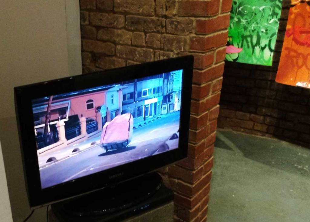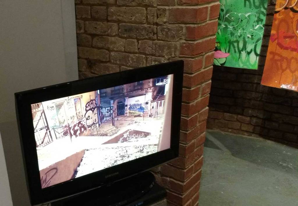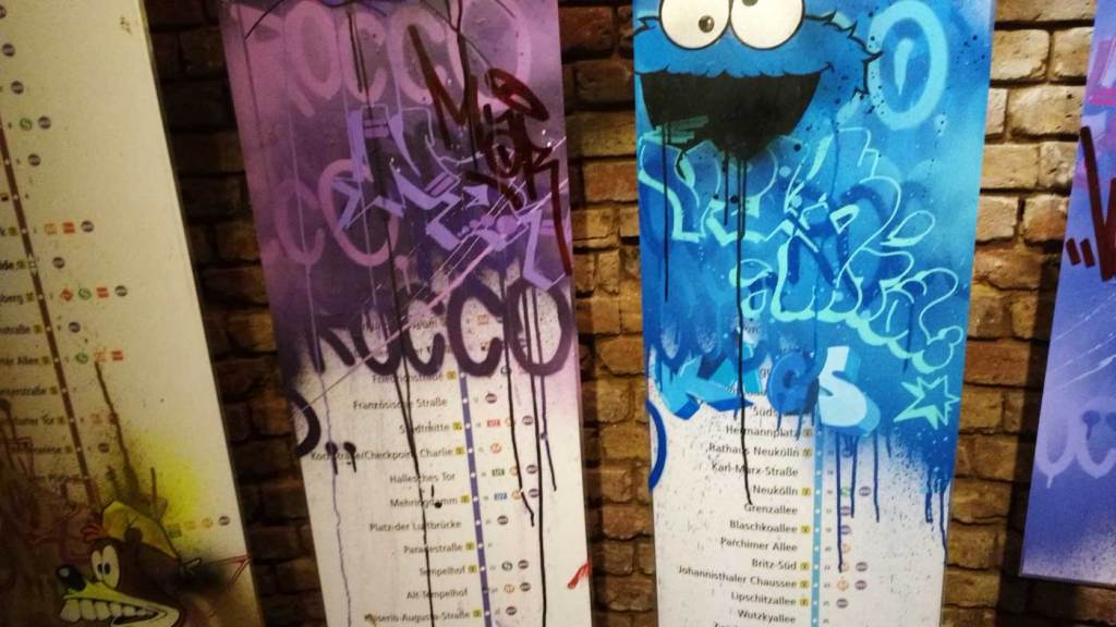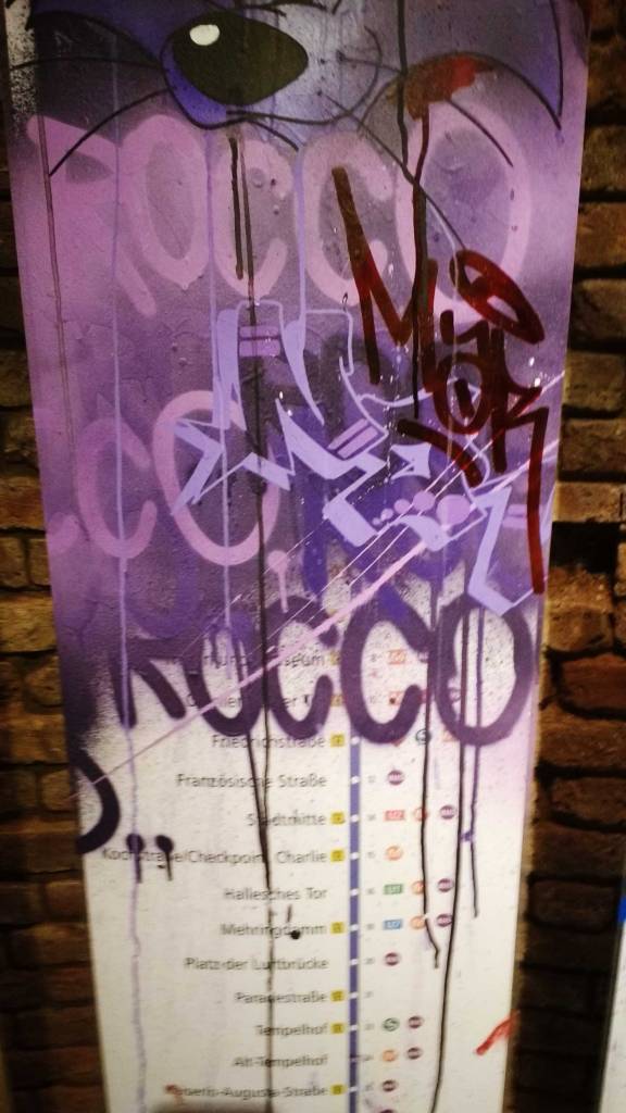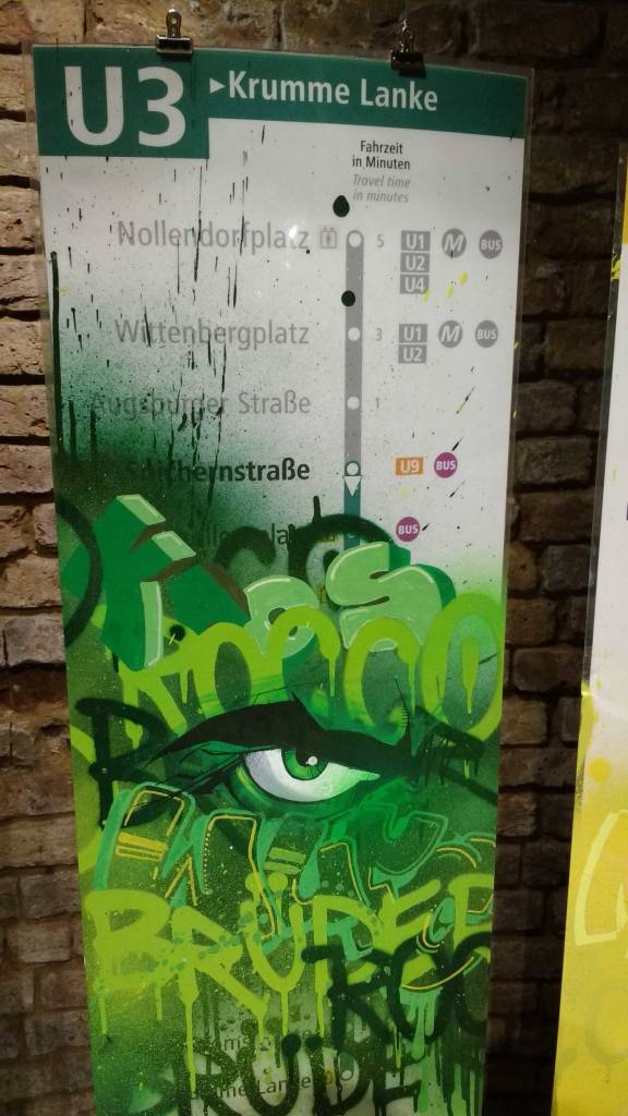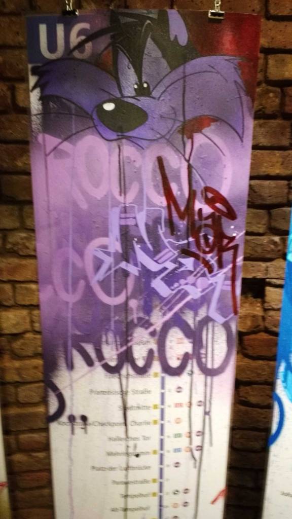 Who are Rocco and his Brothers? What have they been doing in Berlin? Mysteriously installed rooms in German underground stations, statues in parks, actually, there’s a lot more than just a bunch of vandals gathering together at BSMT Space tonight.This art show might slip under the radar of pretty much everyone besides the vast graff/writing underground community (where’s the street art crowd tonight, lot of the usual faces missing), but these films of Rocco and his Brothers are important, this is important art, these rooms of his and his brothers. Who are Rocco and his Brothers? We’re not talking about a 1960’s Luchino Visconti film here, who is Rocco? Something important happening here, something a little more vital and important, art a little more important and a little more vital than a politely painted train set in the Tate! These mysterious rooms are Turner Prize good, this is important contemporary art, these things Rocco and his Brothers are doing are as vital in terms of contemporary art as anything that’s happening right now.
