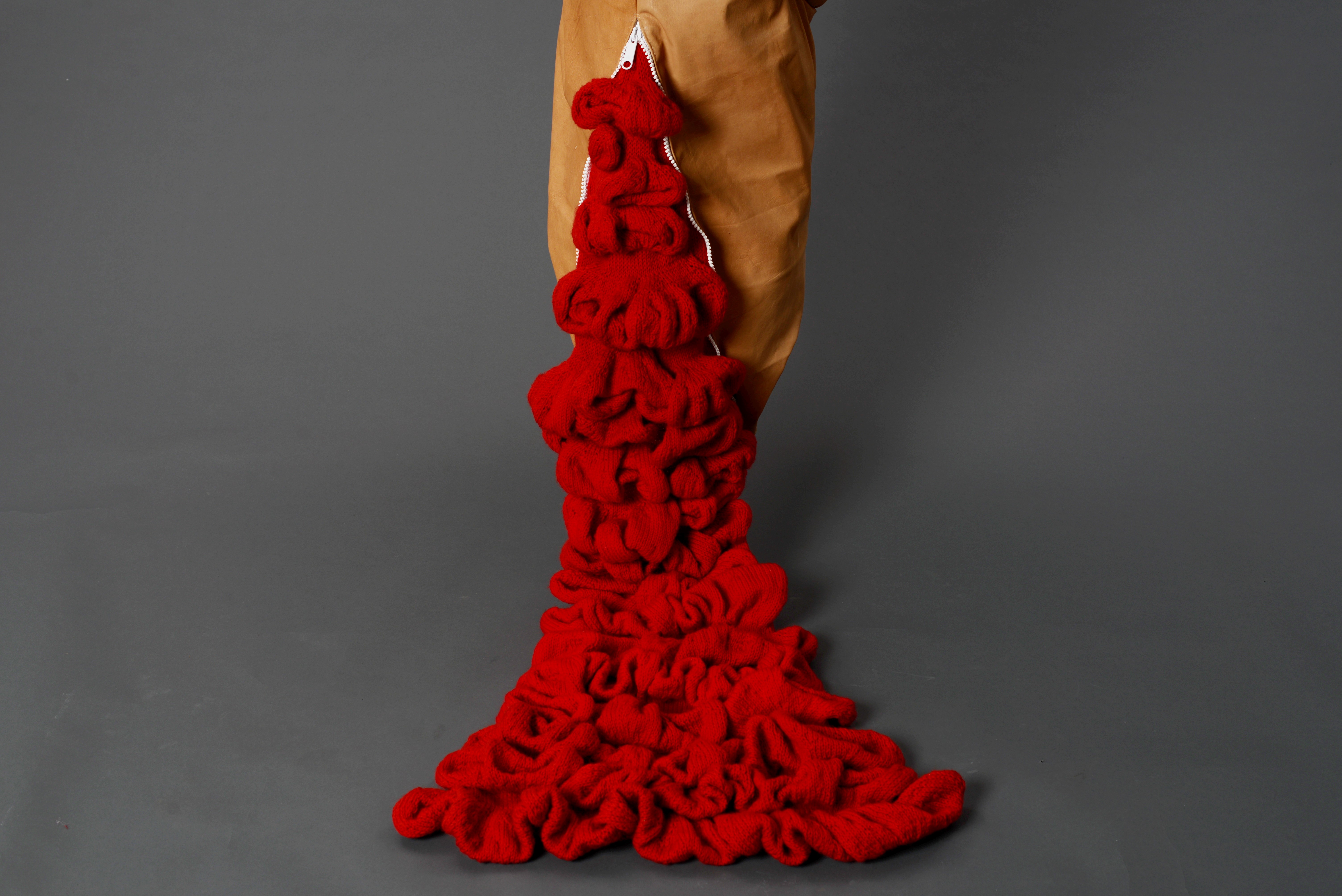 30: Artist: LOU BAKER. Title: Other 5, (2015), Detail, leather, zips, hand knitting; stitch Detail of a hanging soft sculpture. The whole sculpture measures H137 x W55 x D60cm