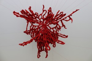 32: Artist: LOU BAKER. Title: All the babies I might have had I, (2011). Hand knitted wool, felted, thread. Hand knitted soft sculpture which has been felted, suspended with red thread, approx.100 x 100cm