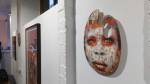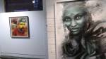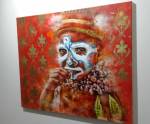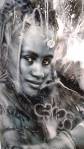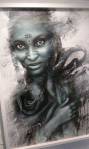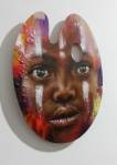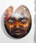 His work on the street is something to behold, those faces through the clutter and the smells and the nosie and the traffic Dale Grimshaw is clearly an artist worthy of all the attention he’s rightly enjoying at the moment, last night, in this polite quiet gallery his work felt restrained, stunted, his statements controlled and dare we say somewhat sanitized? There’s no denying that Dale is a beautiful painter, a technique to be admired, eyes to look into, those eyes are vital, these eyes do the speaking, and he is making important points here with his impressive portraits of those threatened indigenous people – these aren’t just painting of random stylised tribal-looking nothingness, Grimshaw’s style and statements are to be admired, but did the gallery show have to be so damn polite and “proper”, so conservatively hung, so restrained in polite frames, couldn’t he have brought just a little bit of the danger of the street indoors? Just a hint of the attitude? Even when he does take to painting on artists pallets and outside of a frame it seems a little twee, a little polite, does it all a little to coffee table in here?