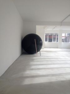 10: Artist: ANN CARRAGHER , Title: All Our Laments (2017): Medium: Black latex balloon, wood, balloon 182 x 182cm, wood 152cm each – in collaboration with Garth Gratrix at IBW, Blackpool 2017.