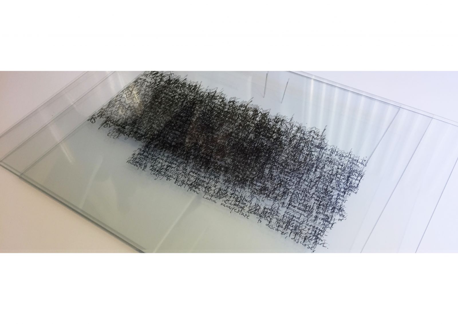 114: Artist: KRISTY CAMPBELL, Title: The Show (2017), Medium: Hand-writing on glass. Size: 20x50cm