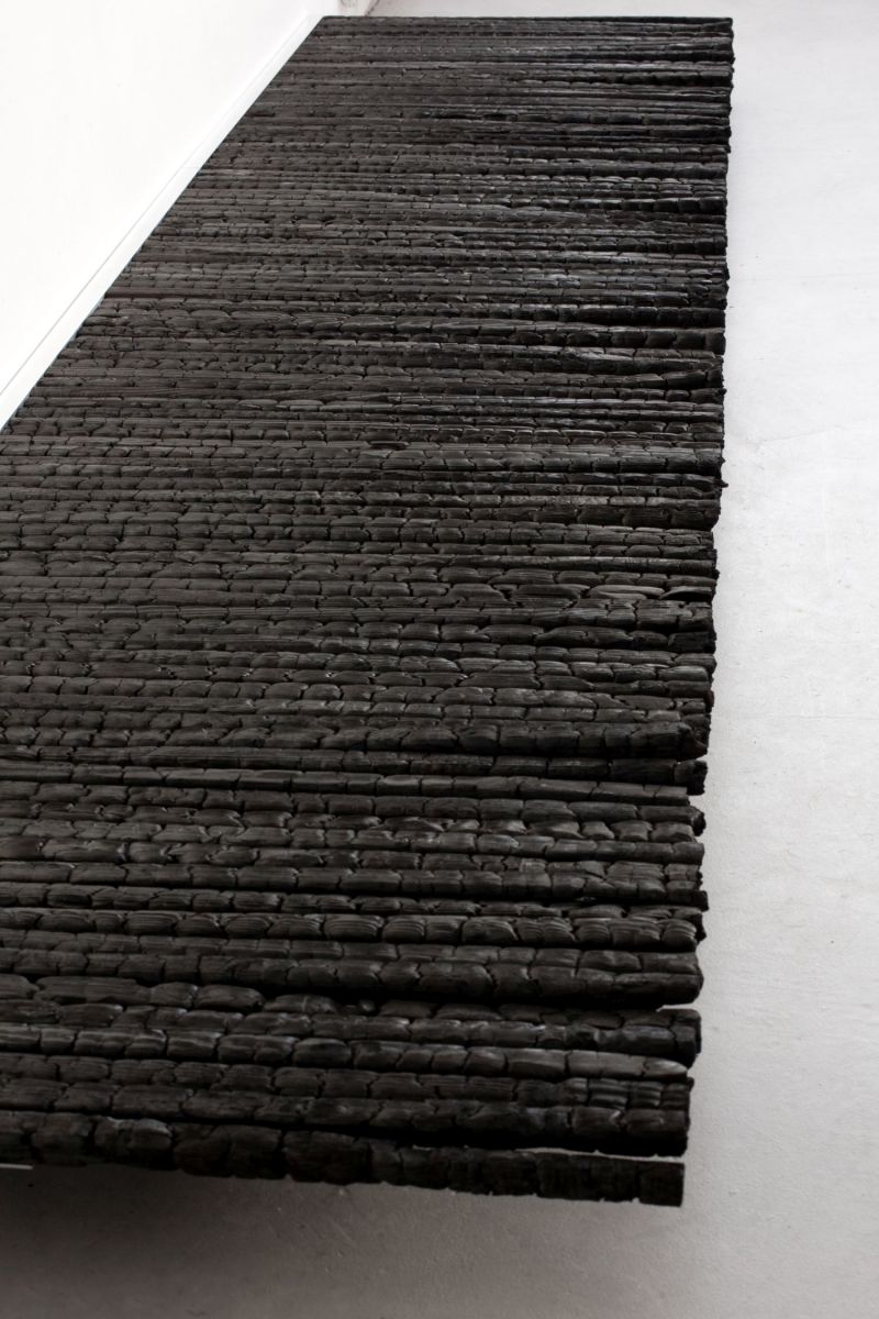 119: Artist: LUCINDA BURGESS, Title: Redwood (2014). Medium, Charred redwood, aluminium, Size 210 x 70 x 1.5cm (raised off floor 15cm)