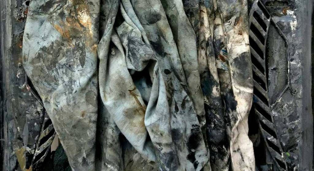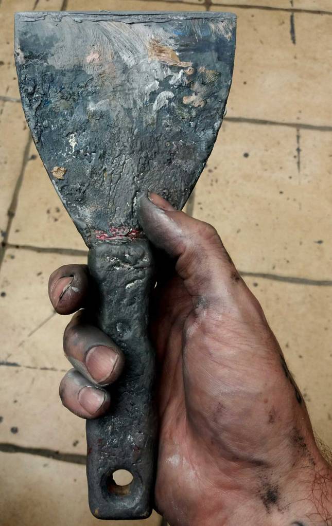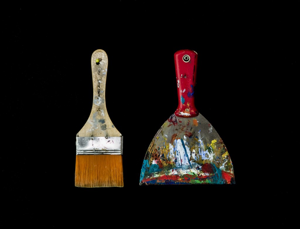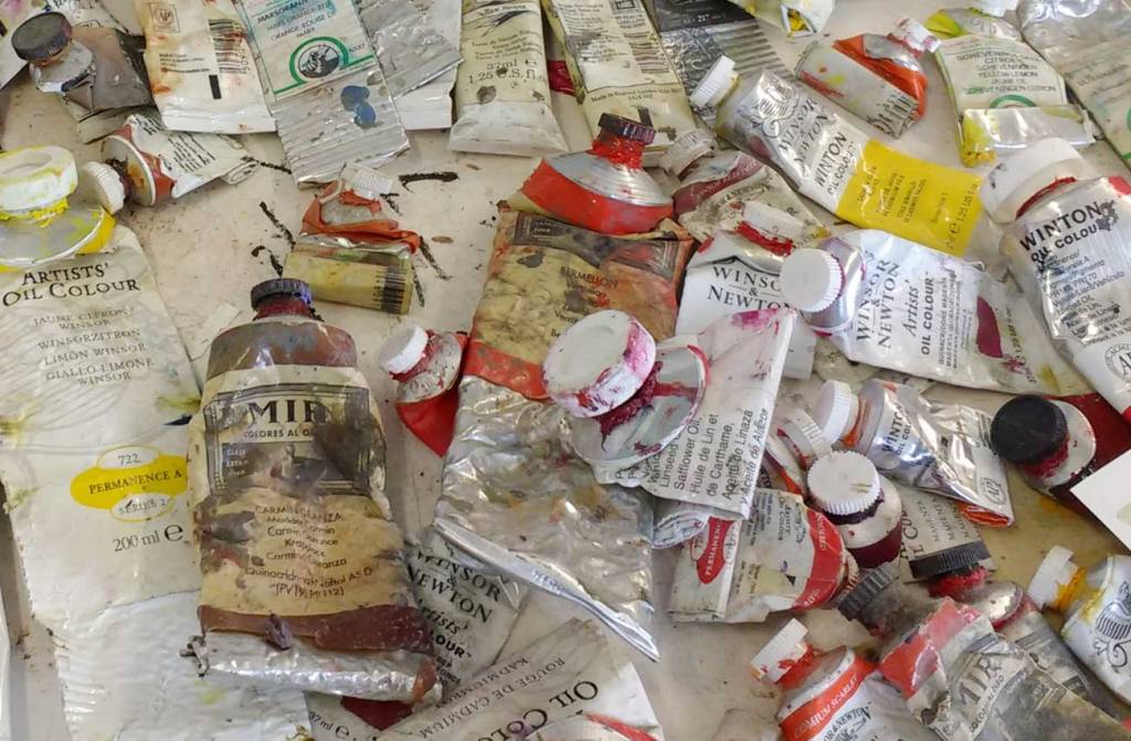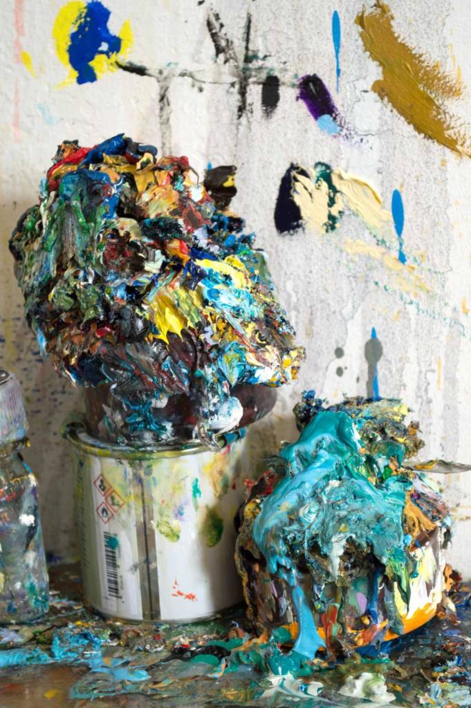 7 – 8: BEN FENTON – “Ben originally comes from Dungeness in Kent, he spent time living in Greatstone, Rye and Winchelsea Beach growing up before moving to London where he attended Goldsmiths College. With the majority of his childhood spent by the Kent and Sussex coastline, and being the son of a local fisherman, he has always had a deep love of the sea and the coast that meets it. His aim in his current paintings is to convey the empty, bleak beauty of these areas and their oddly angular shingled shapes against the expanse of sea and sky” .The photos depict some of the tools and rags he uses to, not only apply, but also remove, the paint in his works