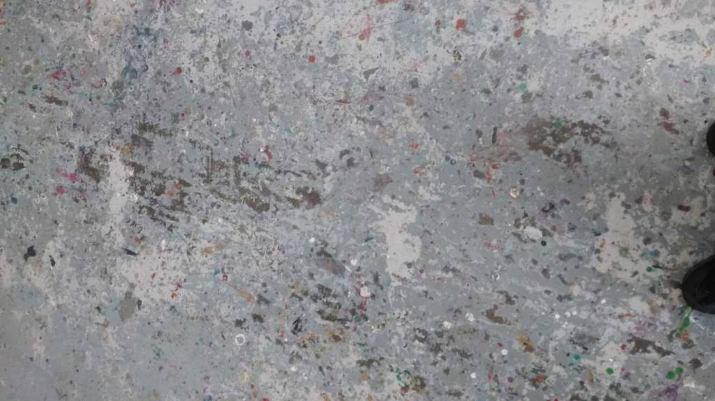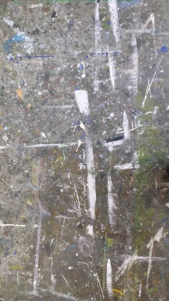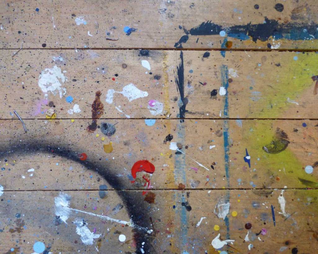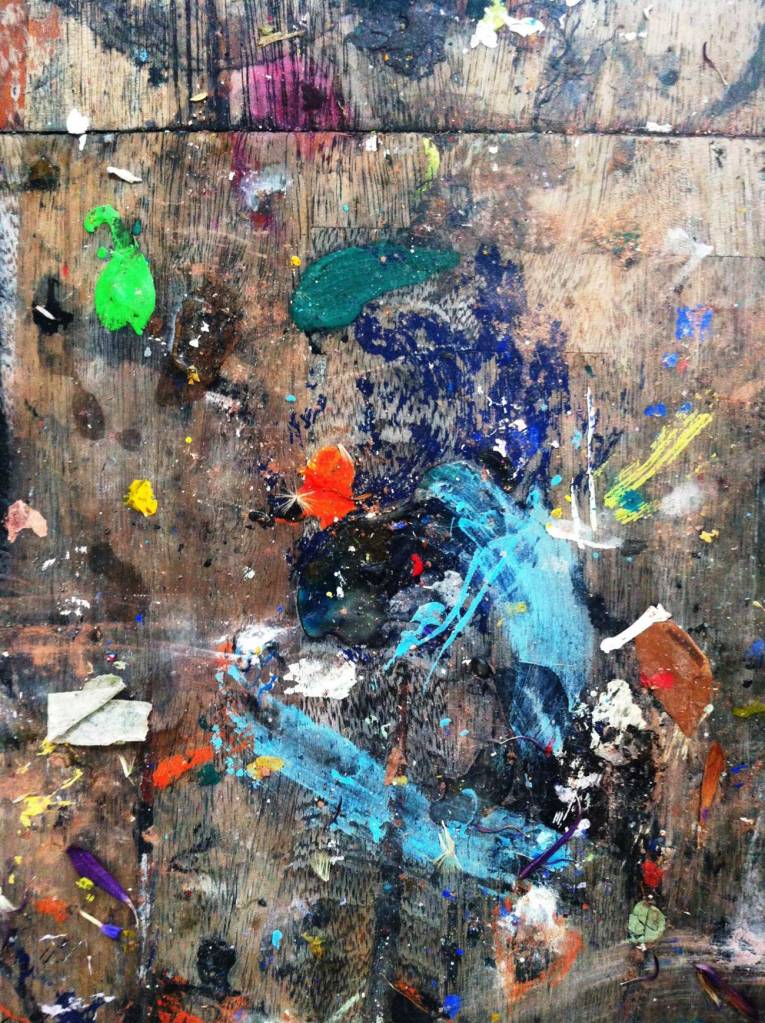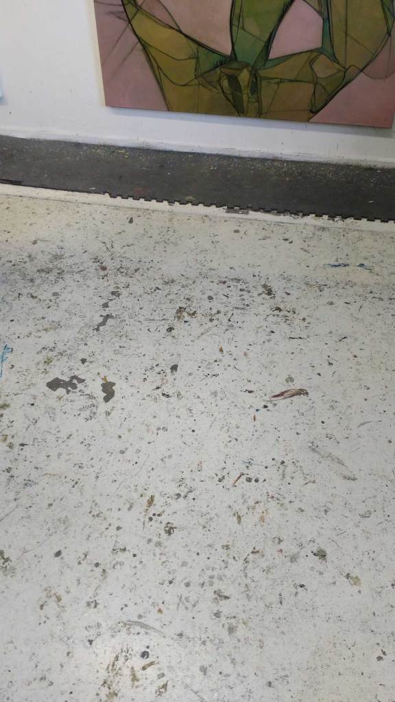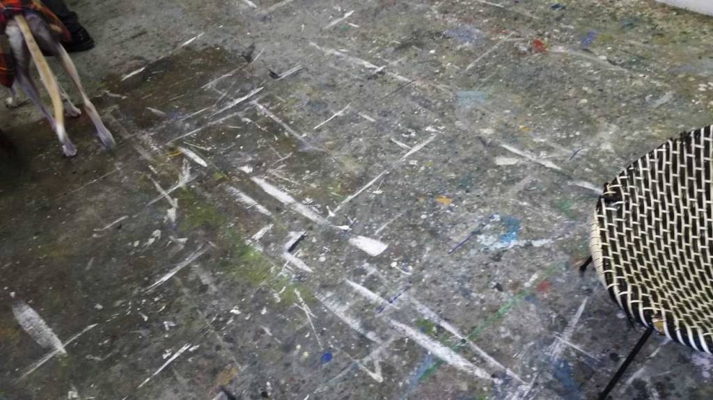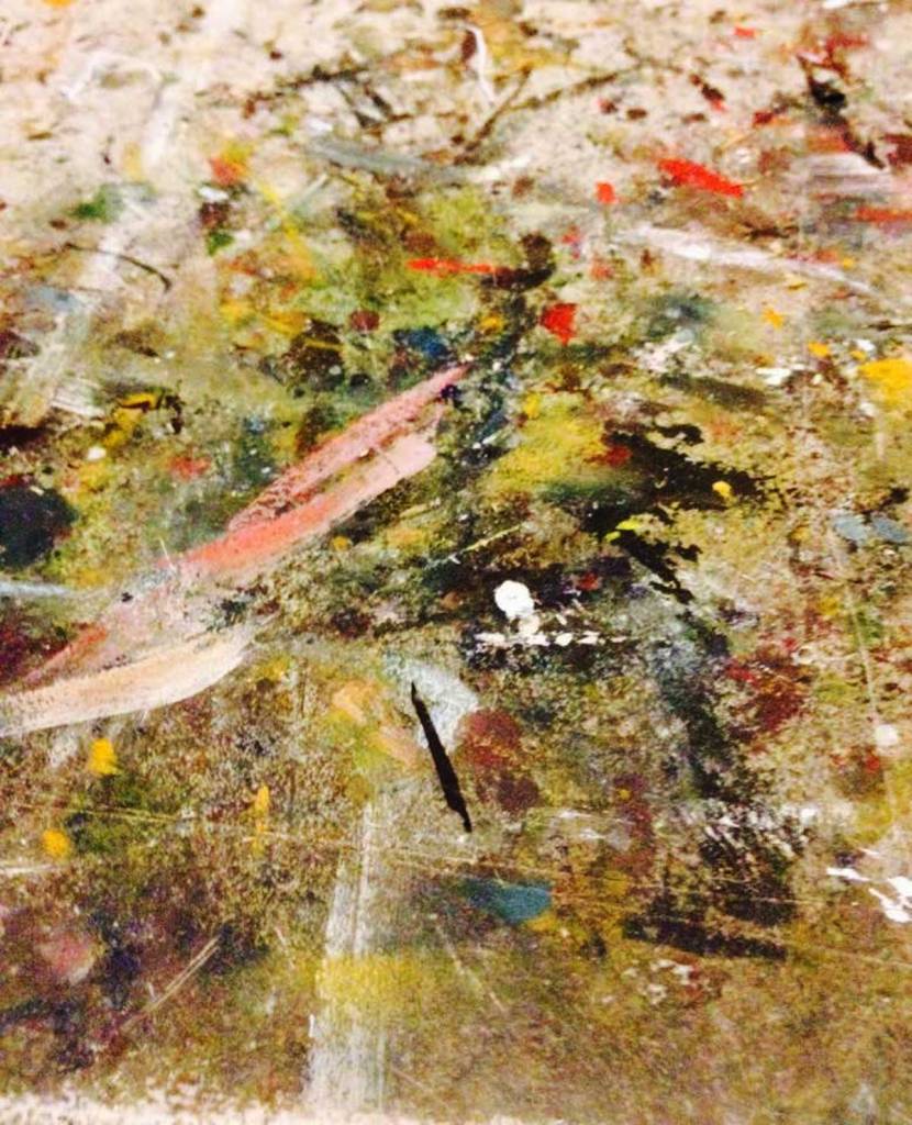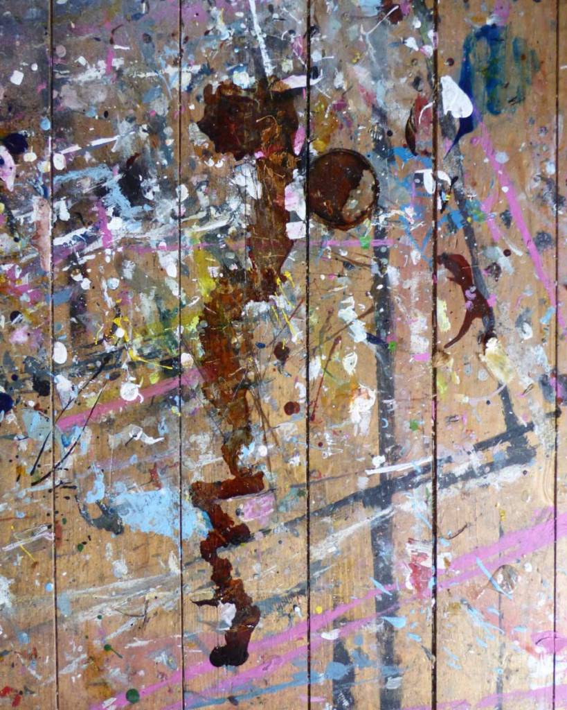 80: JOANNA GEORGIADES – “This is my old studio floor back when I splashed paint around making abstracts. I liked it more than I did my paintings and tried unsuccessfully to recreate it on canvas a few times!”