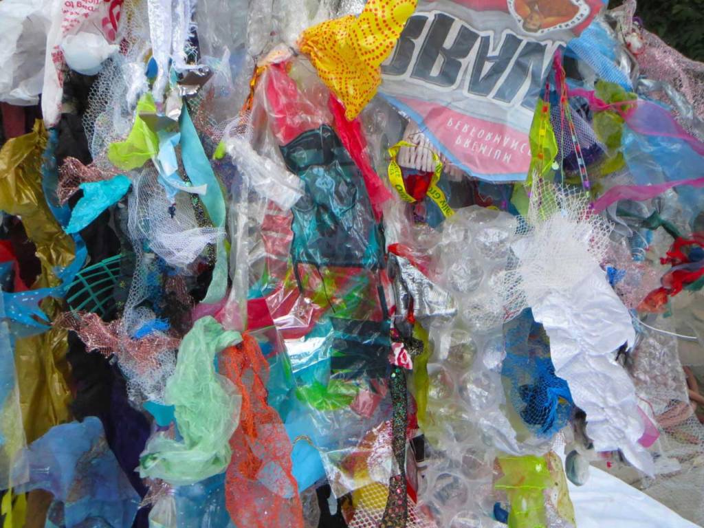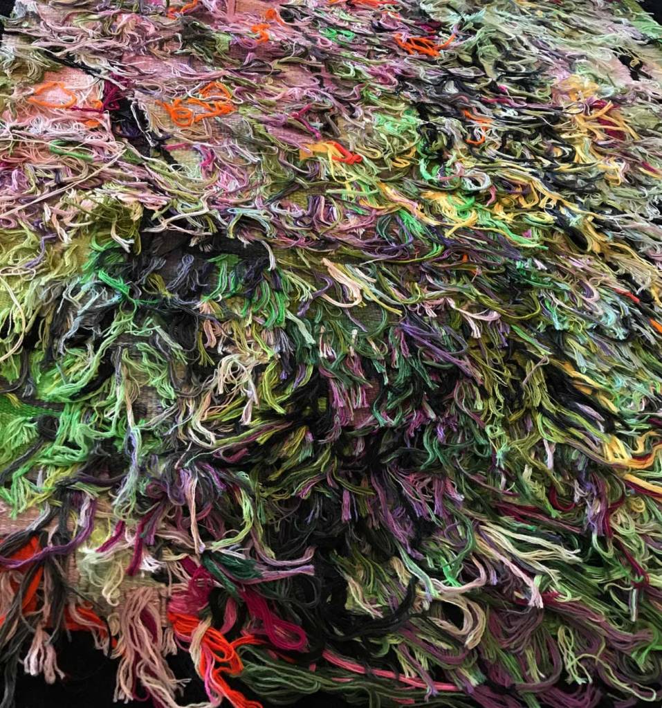 15 – 17: DEBORAH WEIR – “I am a mixed media artist so have photos of 3 very different pieces. There is the backside of the tapestry I took off the loom in September – ends still obviously yet to be undealt with. Piles of household plastics eventually worked their way into a hanging sculpture which has been displayed in two shows in 2017. The third photo is of a canvas surface I used for testing paint and print screens, random fabric snippets and a bit of metal. For the piece with the dangling plastic, Laurie Bucher collaborated. For the Tapestry (for which I submitted the back), my assistant, Jessica Brunnenmeyer, did quite a bit of the weaving”