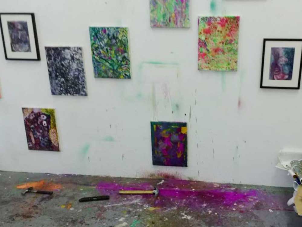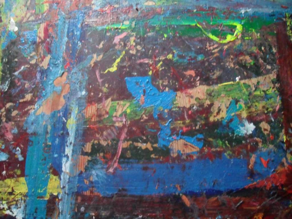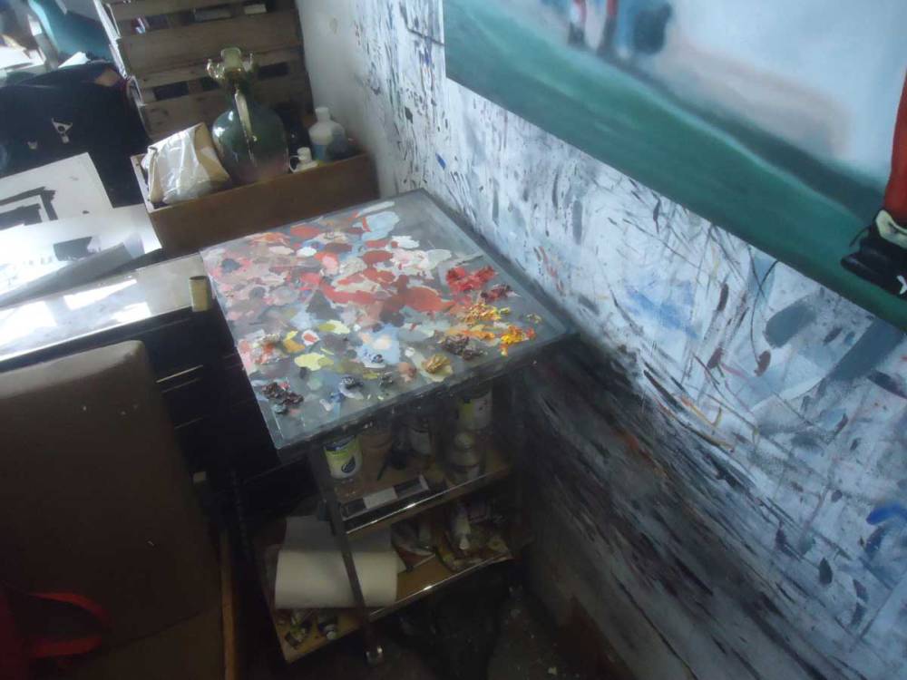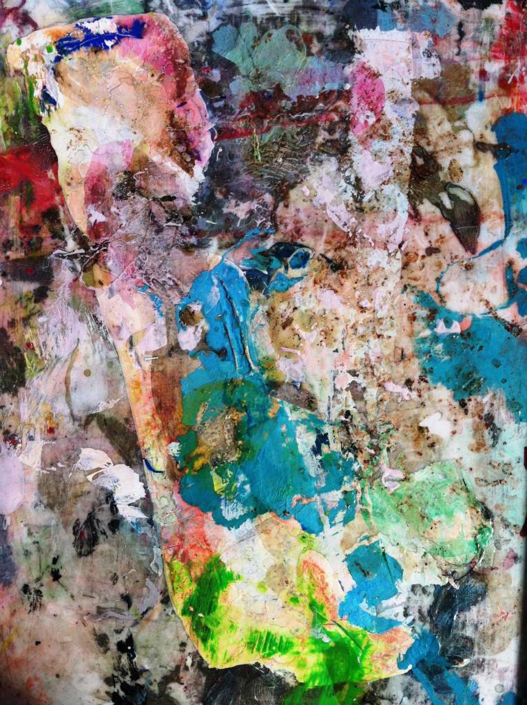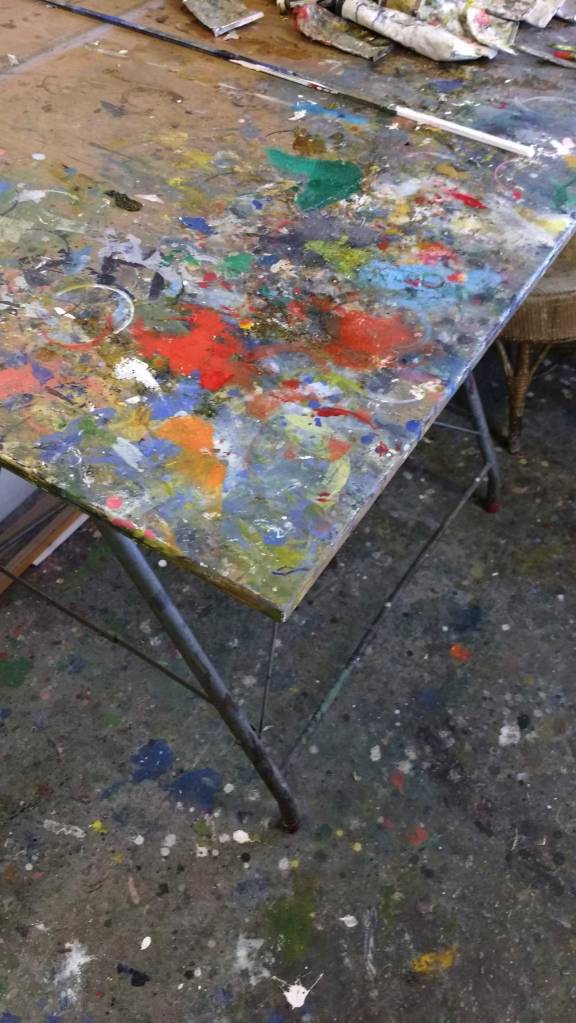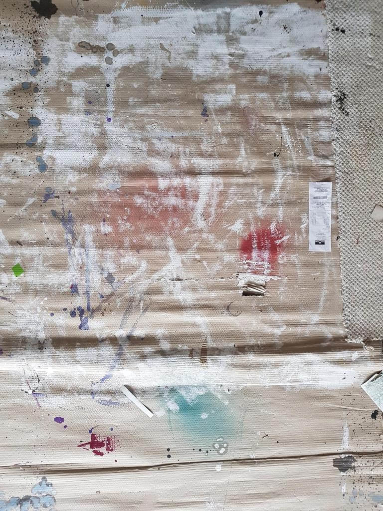 30 – 34: DORA WILLIAMS – “I am a painter searching for abstraction especially abstracting the human forms. My working processes include entropy in mark making and some of my work might have this sort of underpainting. I have attached photos of the studio floor, the table and the board on which I work”.