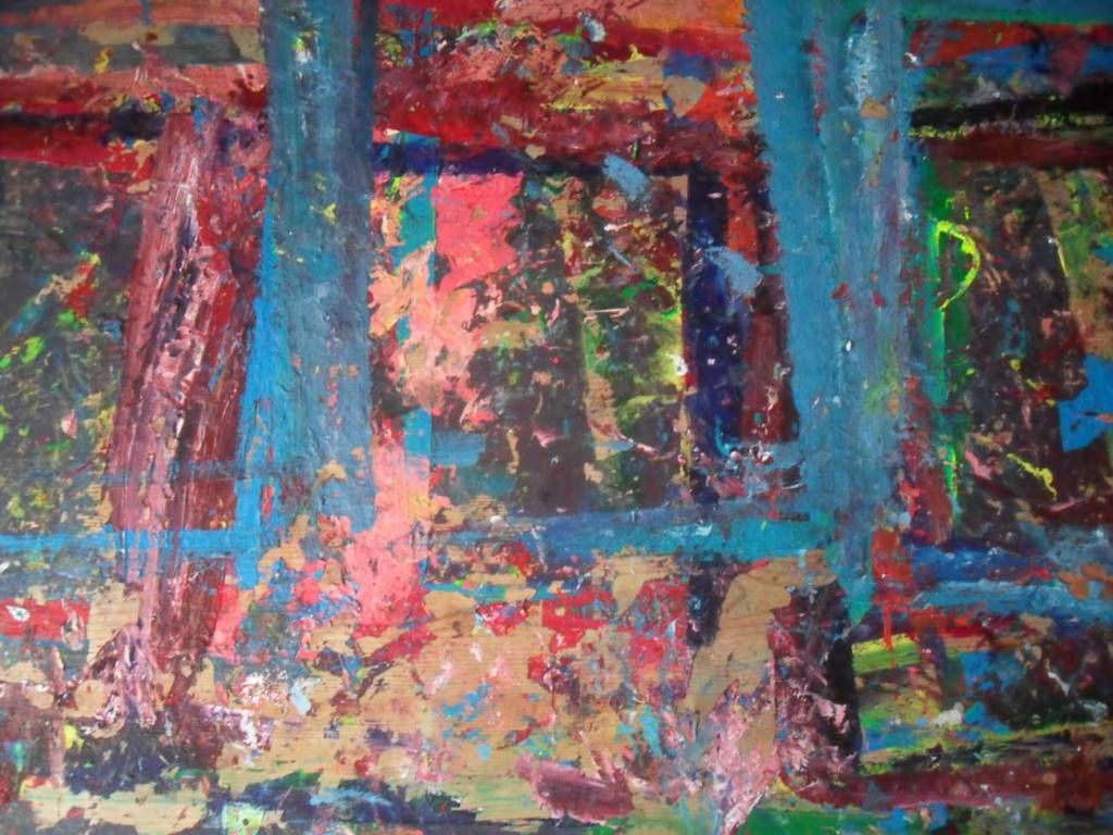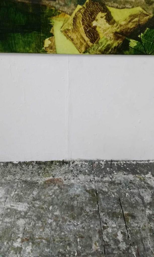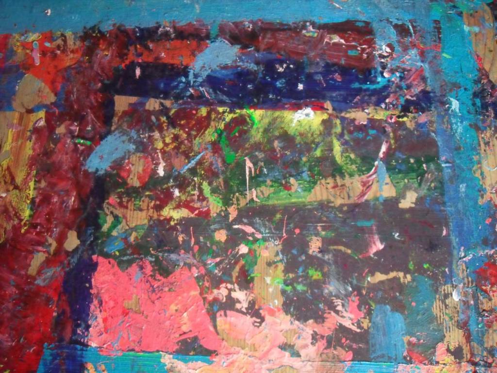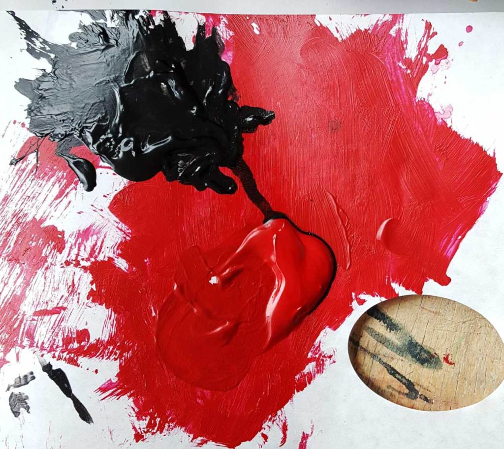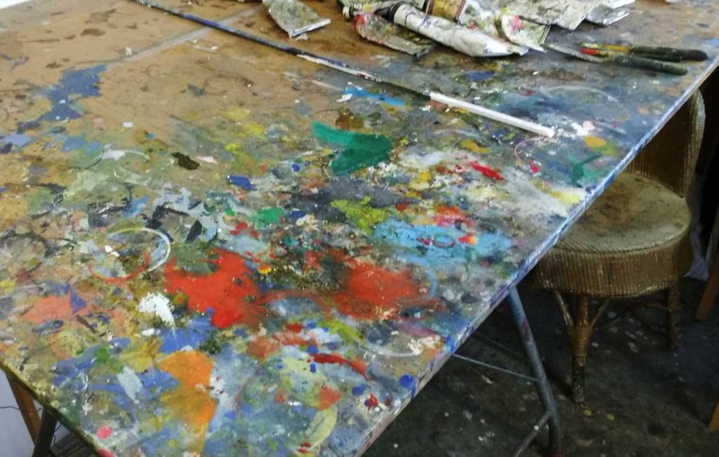 30 – 34: DORA WILLIAMS – “I am a painter searching for abstraction especially abstracting the human forms. My working processes include entropy in mark making and some of my work might have this sort of underpainting. I have attached photos of the studio floor, the table and the board on which I work”.