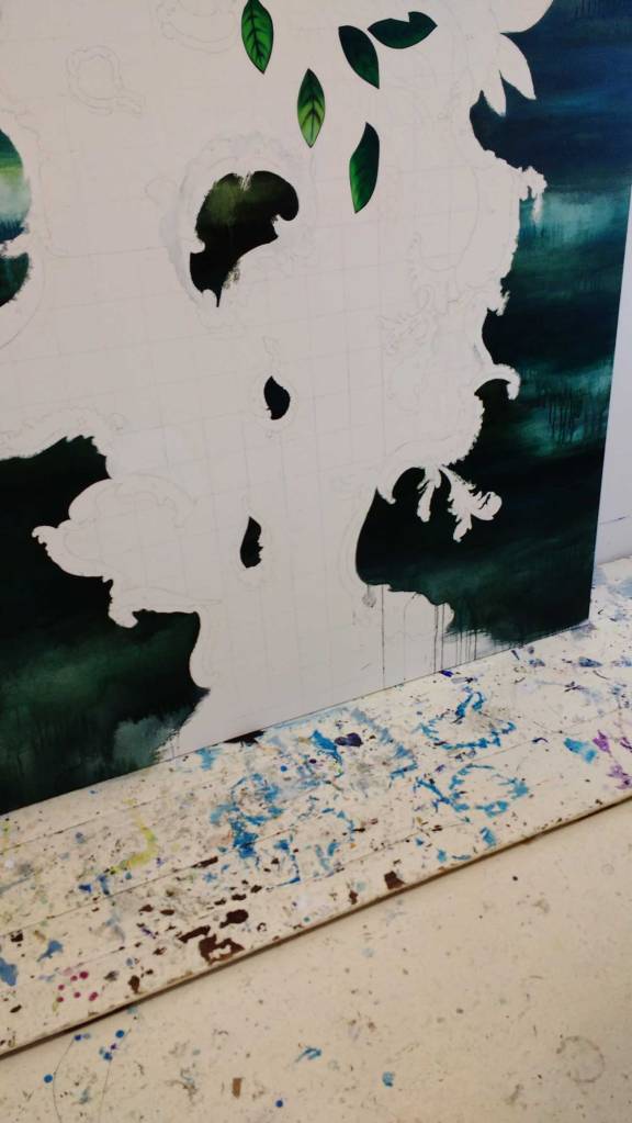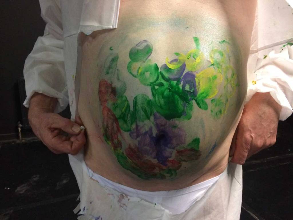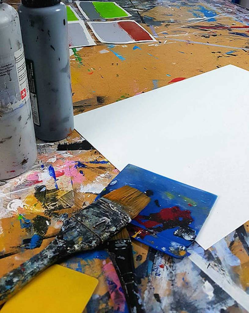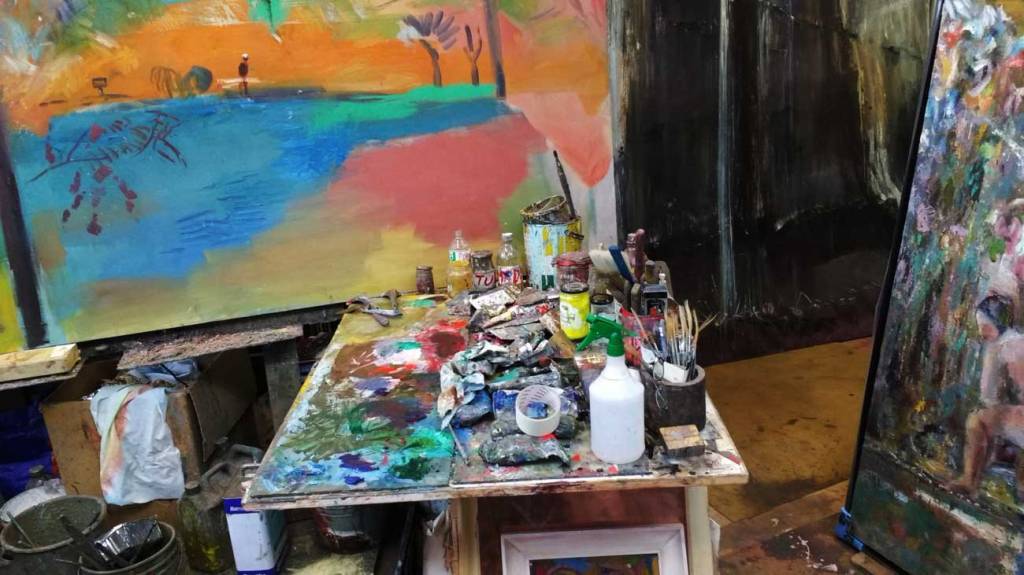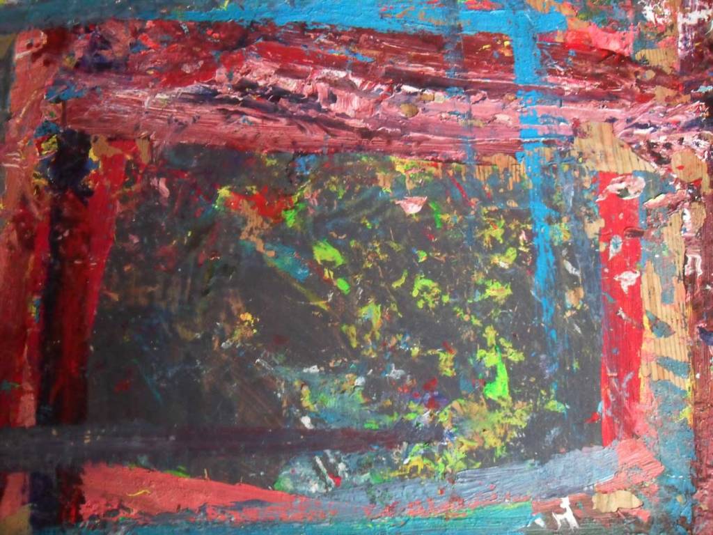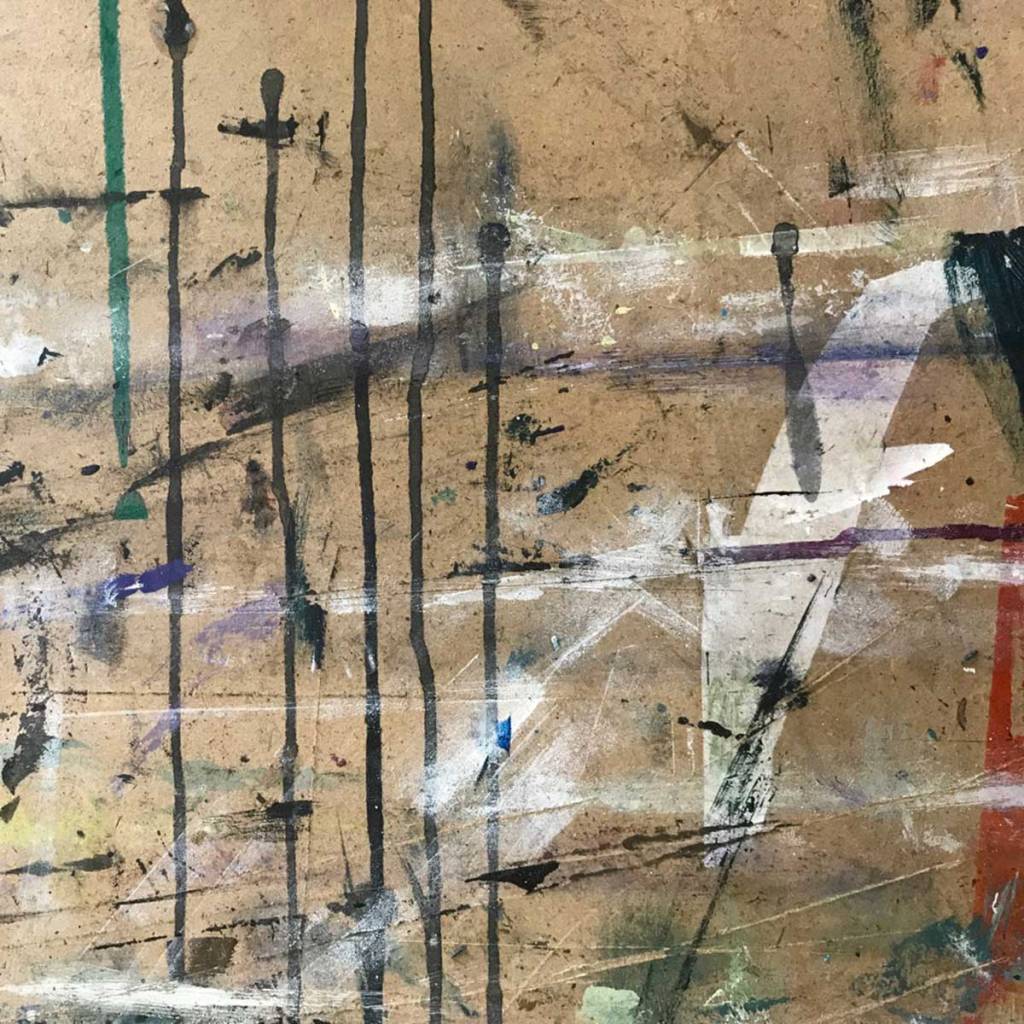 30 – 34: DORA WILLIAMS – “I am a painter searching for abstraction especially abstracting the human forms. My working processes include entropy in mark making and some of my work might have this sort of underpainting. I have attached photos of the studio floor, the table and the board on which I work”.