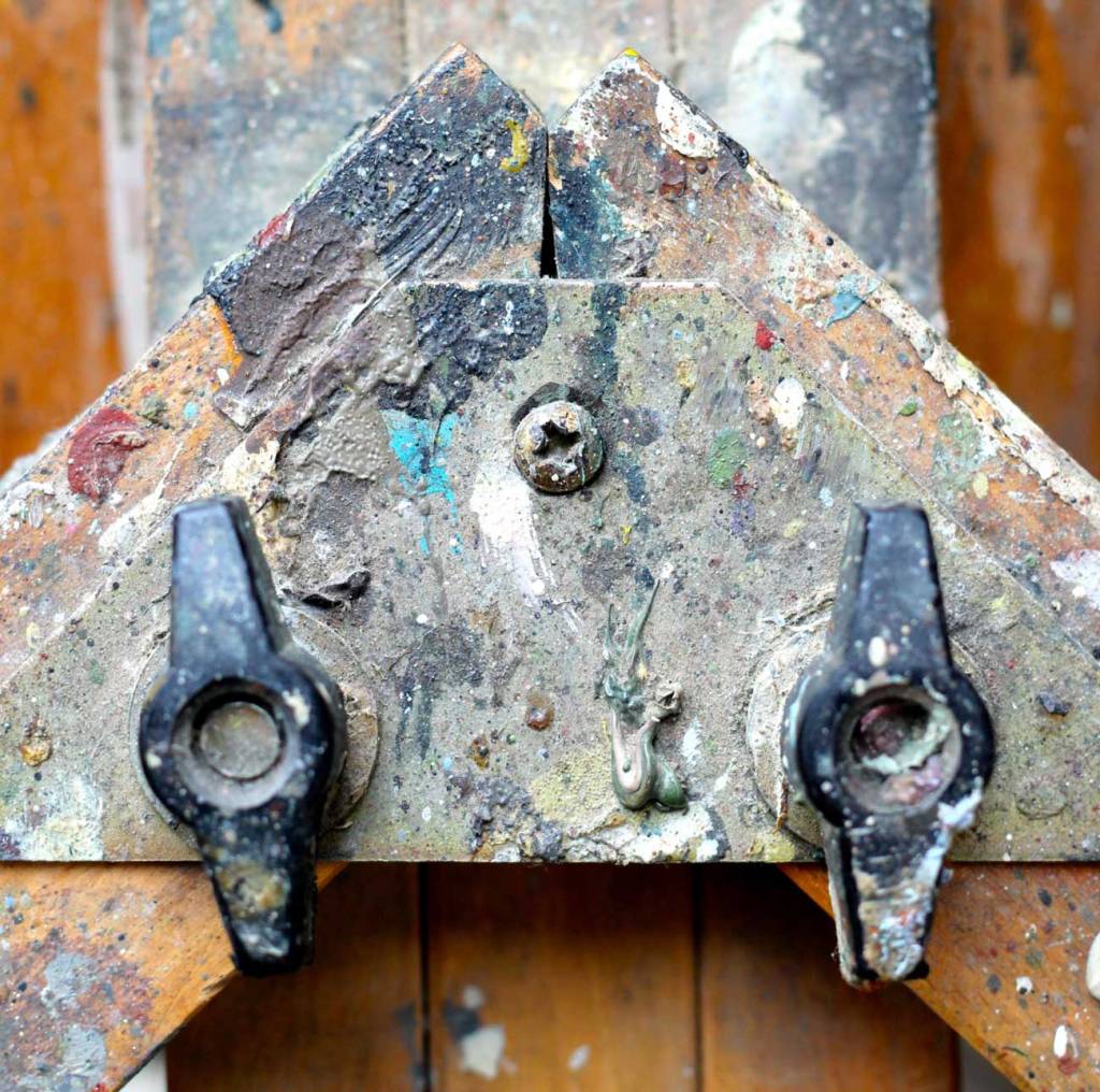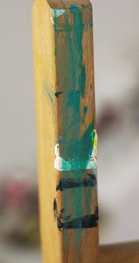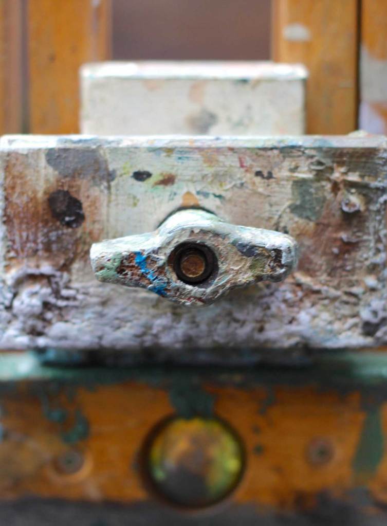 192 – 195: MARTIN HALL – “Martin Hill is an artist based in Dundee, Scotland, predominantly specialising in expressive oil painting. He studied at Duncan of Jordanstone, and based on the success of his degree show he was selected for a multitude of ‘Best Of’ graduate exhibitions, including the Royal Scottish Academy’s ‘New Contemporaries’. He was also awarded the 2009 Barns-Graham Travel Award, and was invited to participate in the RSA Annual Exhibition in 2010. Regularly exhibiting across the country, he has enjoyed several successful solo shows. He also has work in the private collections of the University of Dundee and the Royal Scottish Academy. (Images show close up photographs of the easel I use in my studio, and the incidental/accidental marks that it obtains during the painting process).